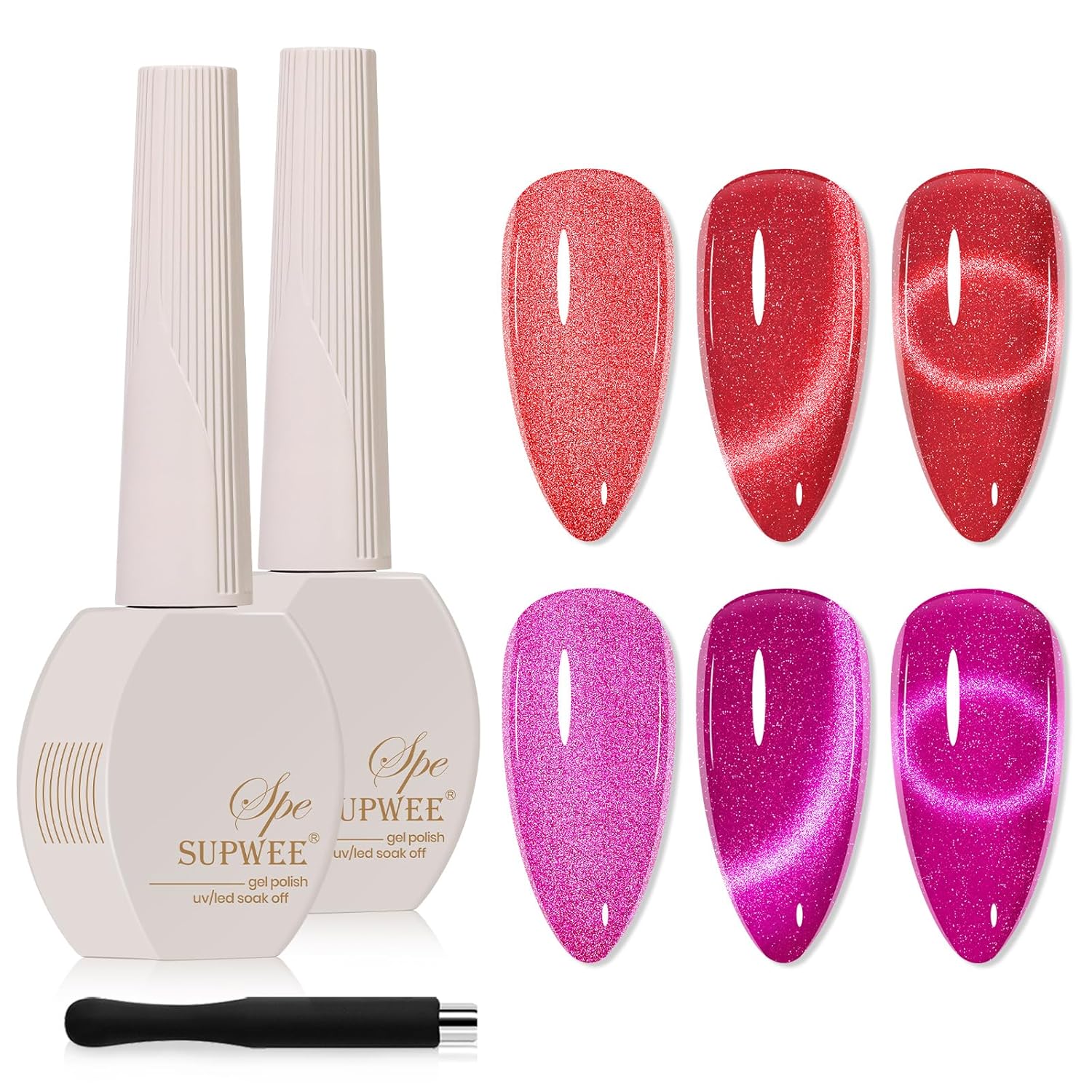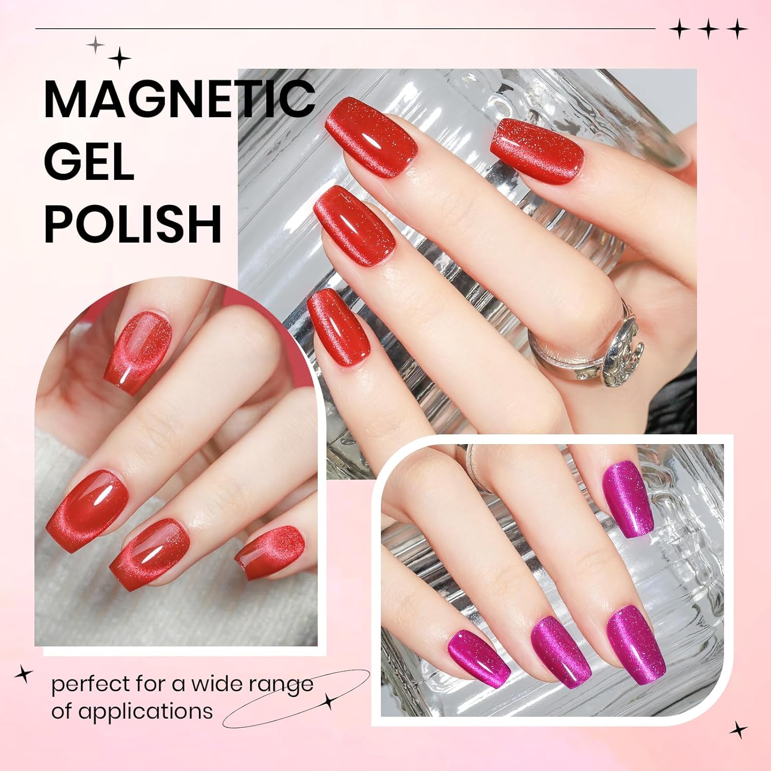 • 2PCS Cat Eye Gel Polish: 2*15ml(0.5fl oz) red and hot pink cat eye gel nail polish with 1PC magnetic stick. Mixed with smoothie magnetic glitter, it's perfect for making a statement