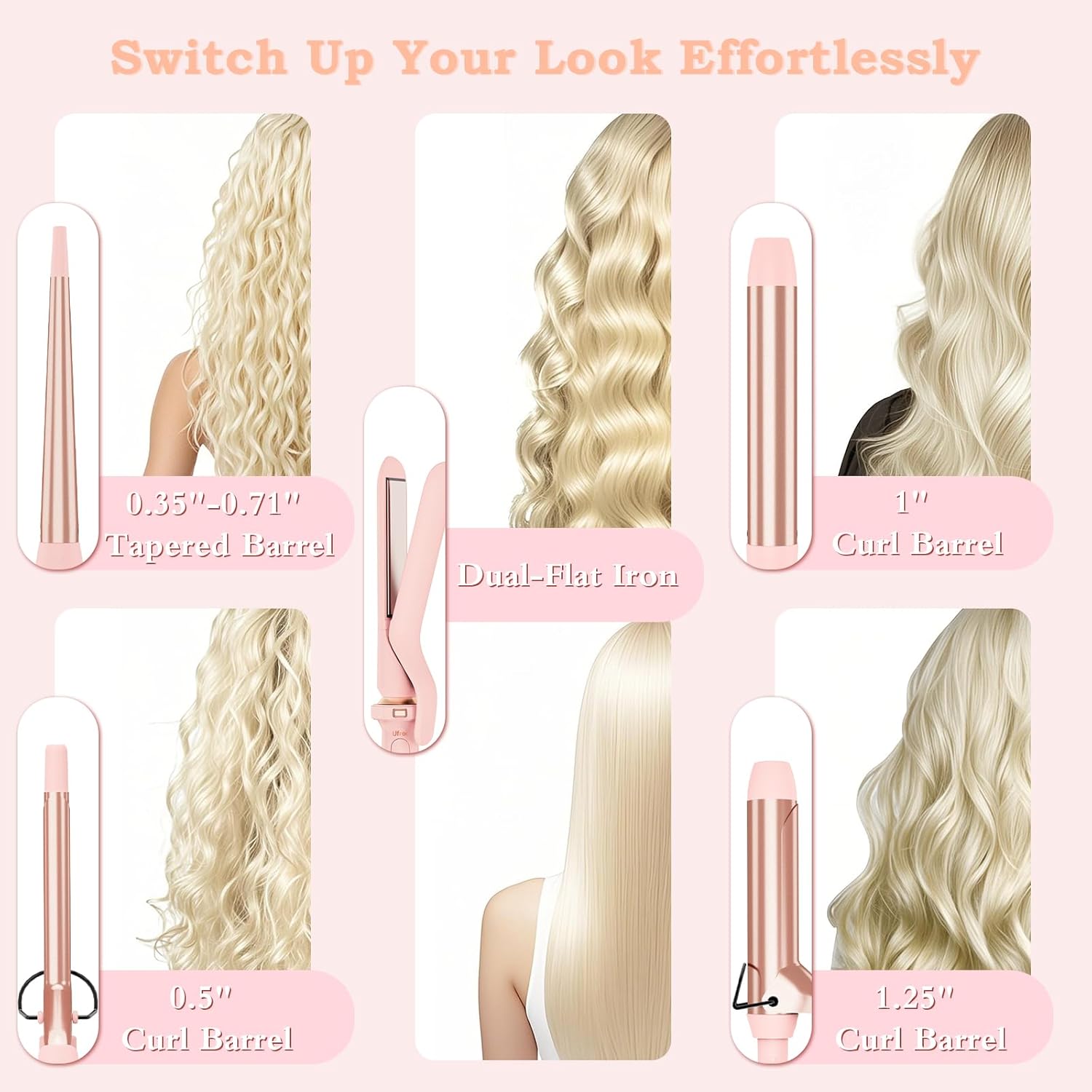 • Versatile Curling Iron Set: Ufree curling iron set offers versatile styling options and tailor your look with five precision barrels, including a 0.35-0.71 inch tapered barrel, 0.5 inch curl barrel with clip, 1 inch curling wand, 1.5 inch curl barrel with clip, and a specialized hair straightener for styling flexibility.Whether you're straightening or curling, long hair or short hair, this all-in-one set has you covered