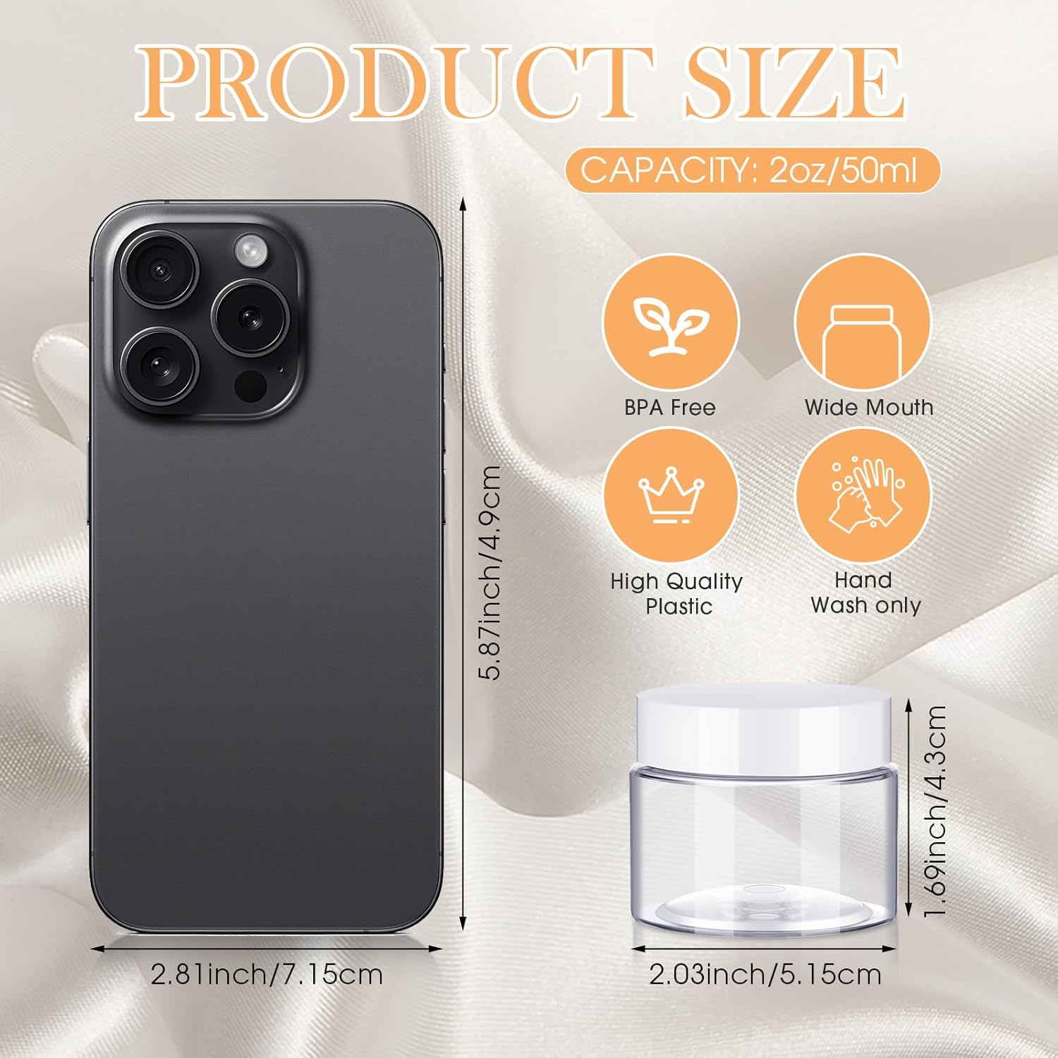 • Package Includes: 100 pieces of 6 oz plastic containers with lids, each small plastic jar is about 6.2 cm / 2.44 inches in diameter, about 7.1 cm / 2.8 inches tall, and holds 2 oz, each small plastic jar weighs only 15 grams; The large quantity is convenient for your multiple purposes, suitable for packing and carrying cosmetics at home or travel
