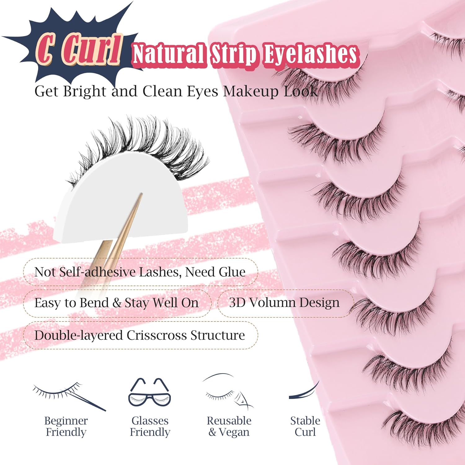Cat Eyelashes Wispy False Eyelashes Natural 12mm Short Lashes with Thin Band Fake Eyelash 3D Volume Strip Lashes Siligli Eyelash Pack 7 Pair