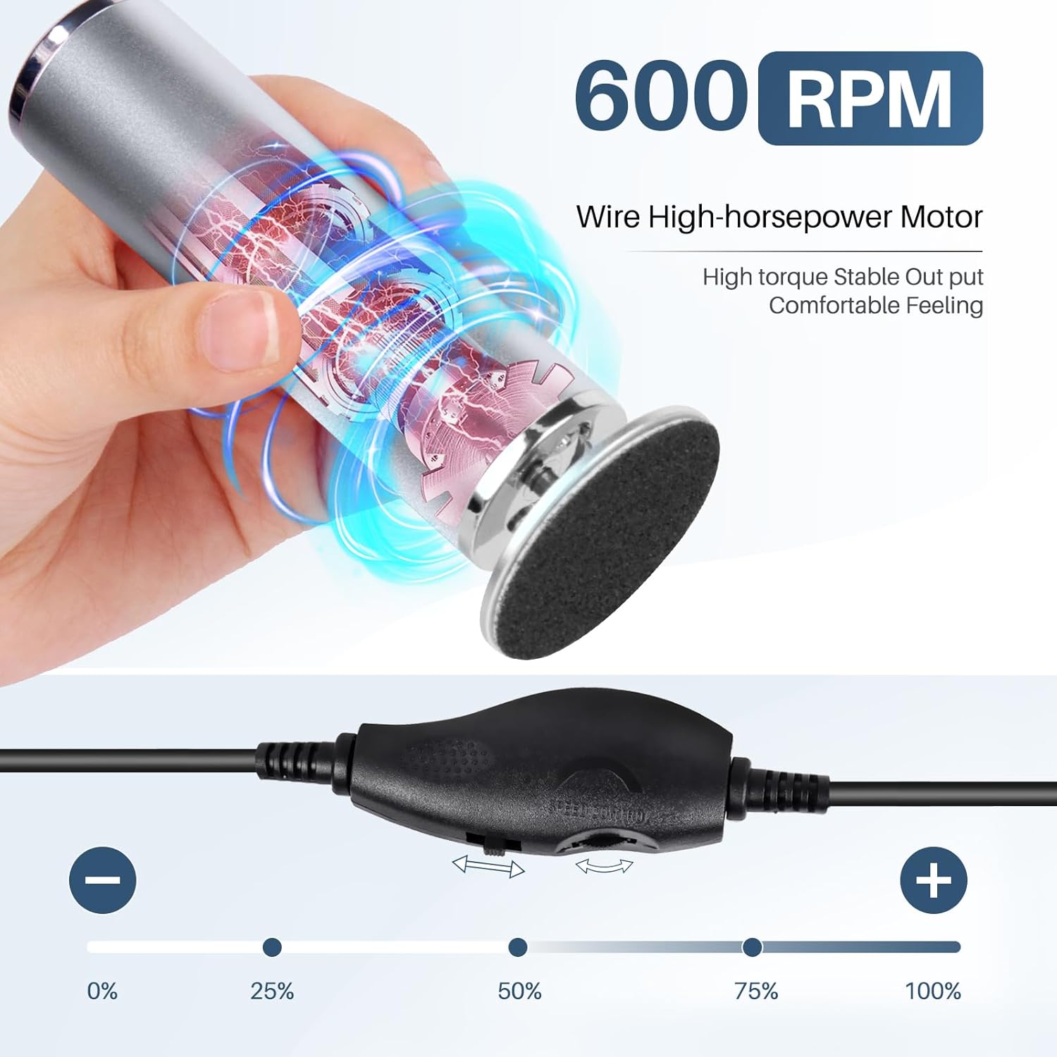 • 【Profesional Pedicure Tool For Feel】The motor of our foot callus remover is made from high-density material,Equipped with High-Precision Motor (0-600 RPM max) ,This allows for rapid acceleration and instant deceleration, Plug-in power is designed to provide strong, continuous power that not only eliminates the need to recharge batteries, but also saves time and effort compared to manual foot file.