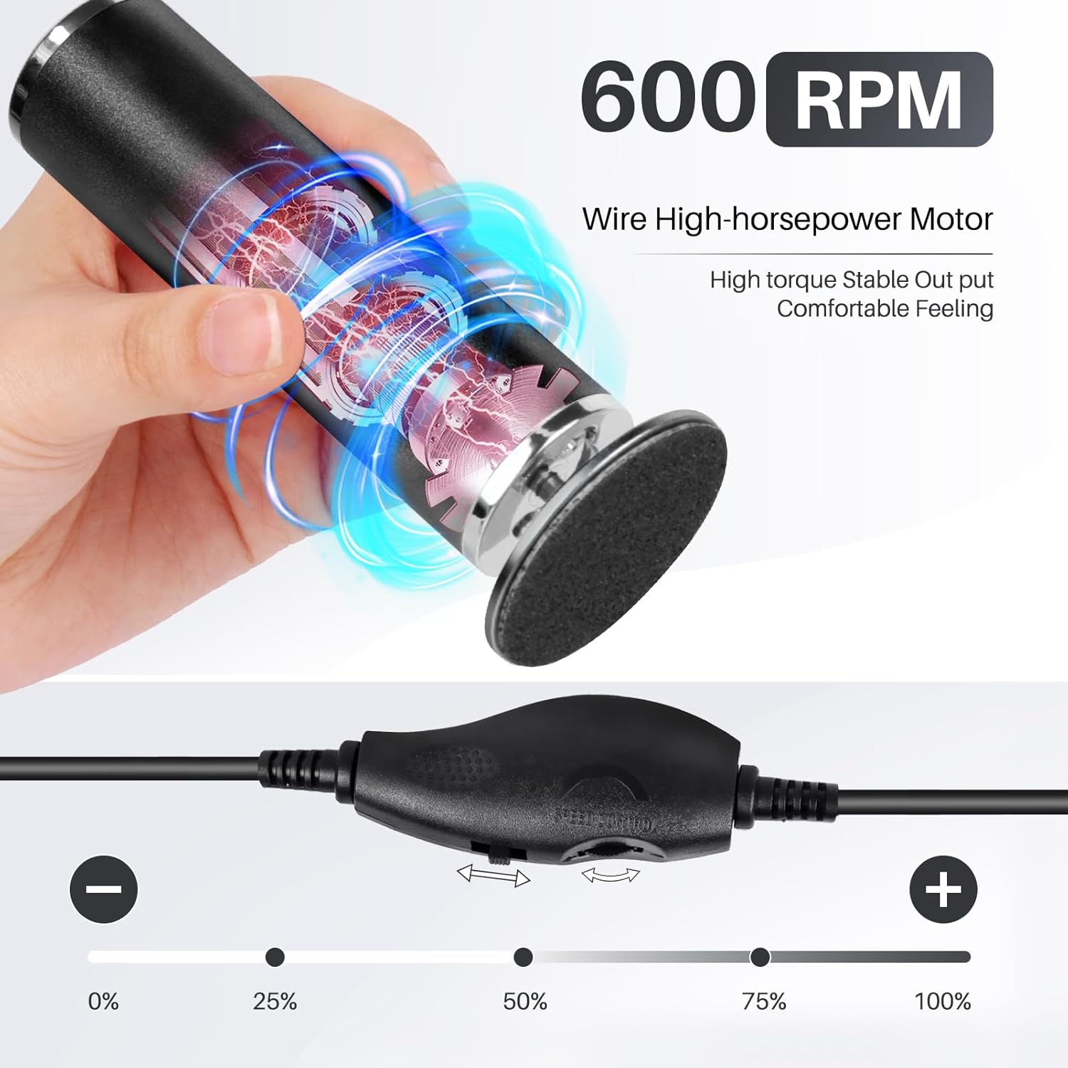 • 【Profesional Pedicure Tool For Feel】The motor of our foot callus remover is made from high-density material,Equipped with High-Precision Motor (0-600 RPM max) ,This allows for rapid acceleration and instant deceleration, Plug-in power is designed to provide strong, continuous power that not only eliminates the need to recharge batteries, but also saves time and effort compared to manual foot file.