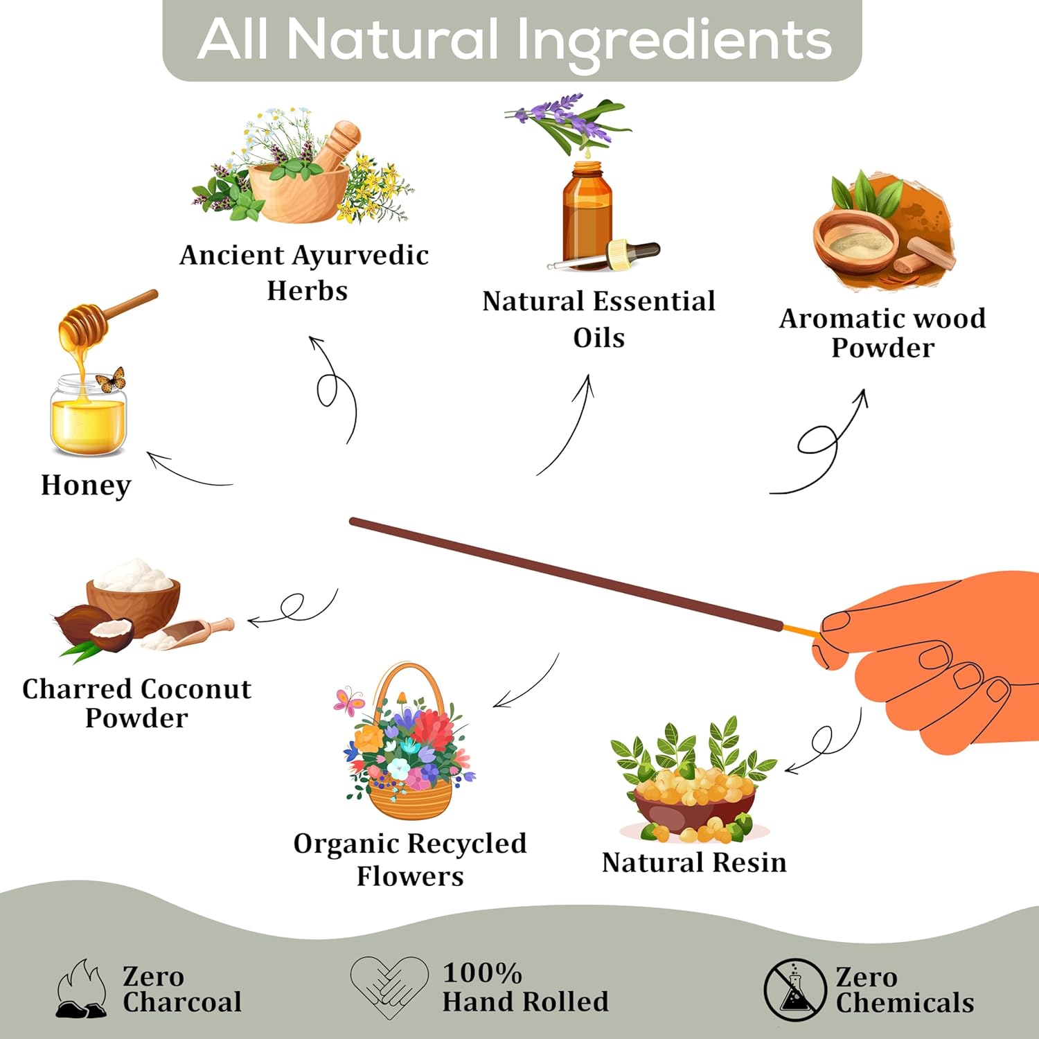 • 100% NATURAL Natural incense Sticks completely handmade MADE FROM SCRATCH by blending natural resins, Herbs, Spices with aromatic wood powders, charred coconut powder fragrant oils and honey.No Dipping in Toxic Chemicals.