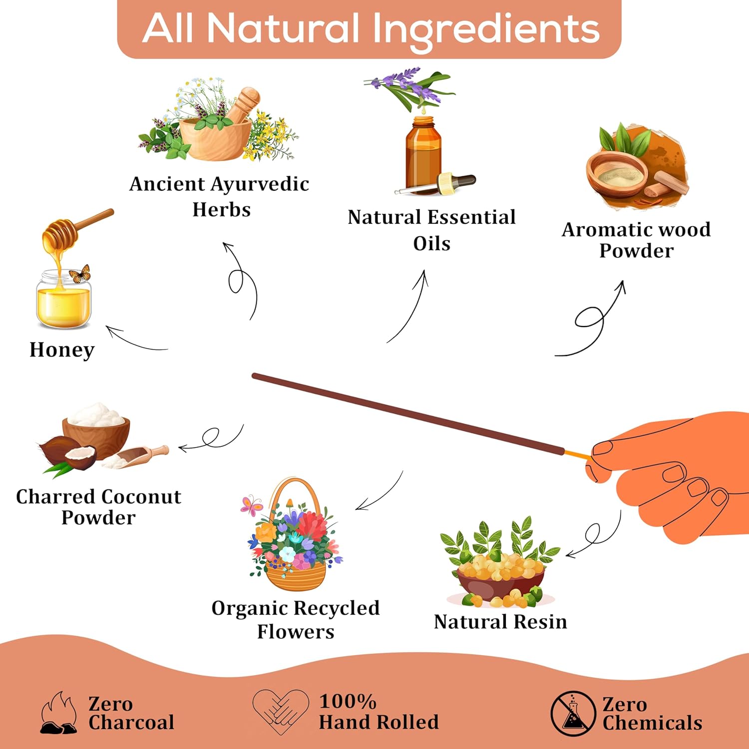 • 100% NATURAL Natural incense Sticks completely handmade MADE FROM SCRATCH by blending natural resins, Herbs, Spices with aromatic wood powders, charred coconut powder fragrant oils and honey.No Dipping in Toxic Chemicals.