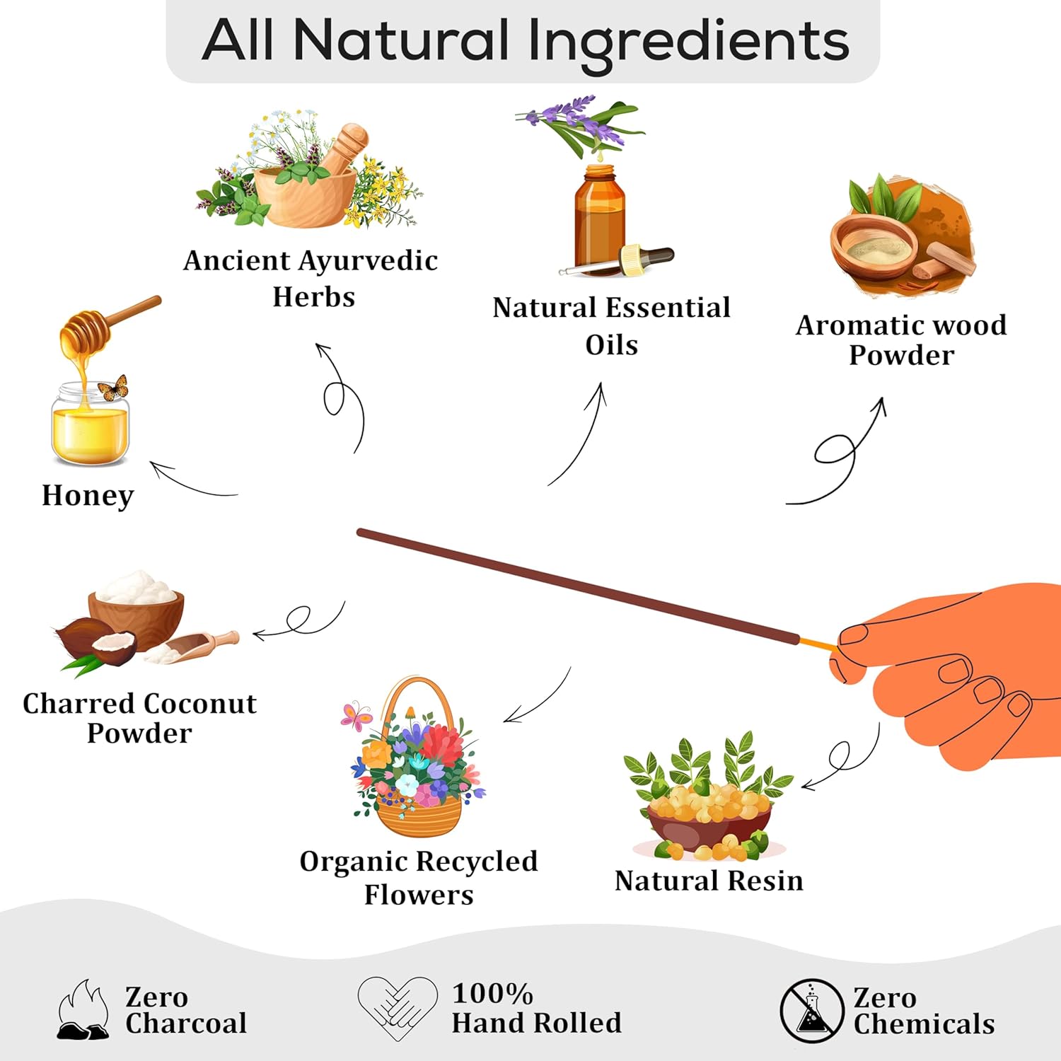 • 100% NATURAL Natural incense Sticks completely handmade MADE FROM SCRATCH by blending natural resins, Herbs, Spices with aromatic wood powders, charred coconut powder fragrant oils and honey.No Dipping in Toxic Chemicals.