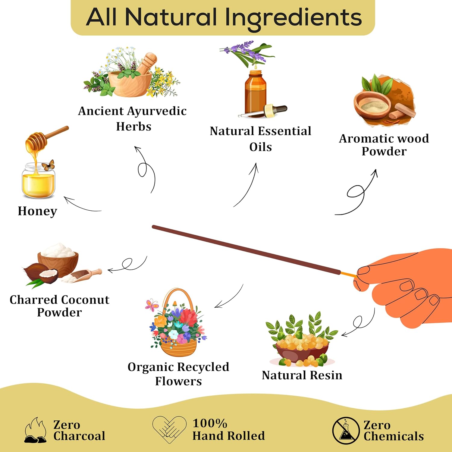 • 100% NATURAL Natural incense Sticks completely handmade MADE FROM SCRATCH by blending natural resins, Herbs, Spices with aromatic wood powders, charred coconut powder fragrant oils and honey.No Dipping in Toxic Chemicals.