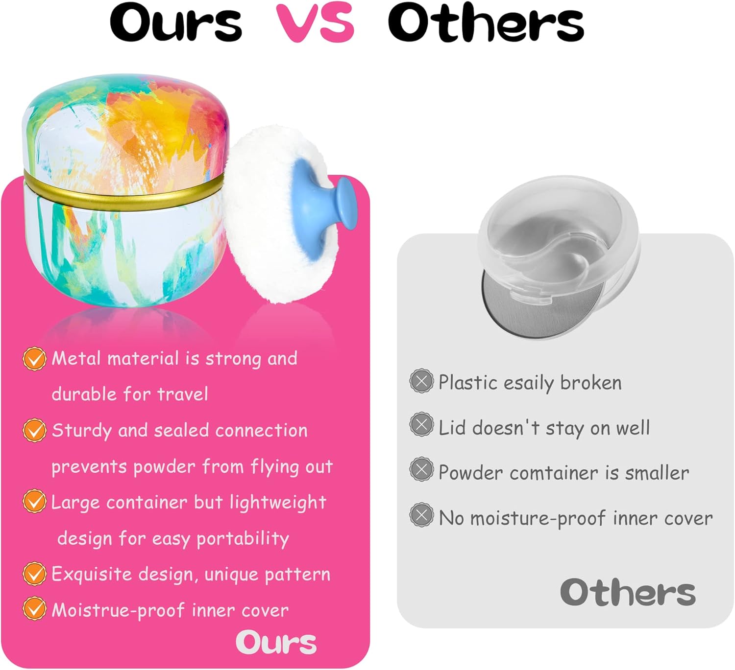 • Product contains a well-made powder case, a high quality powder puff with a handle and a small powder puff.