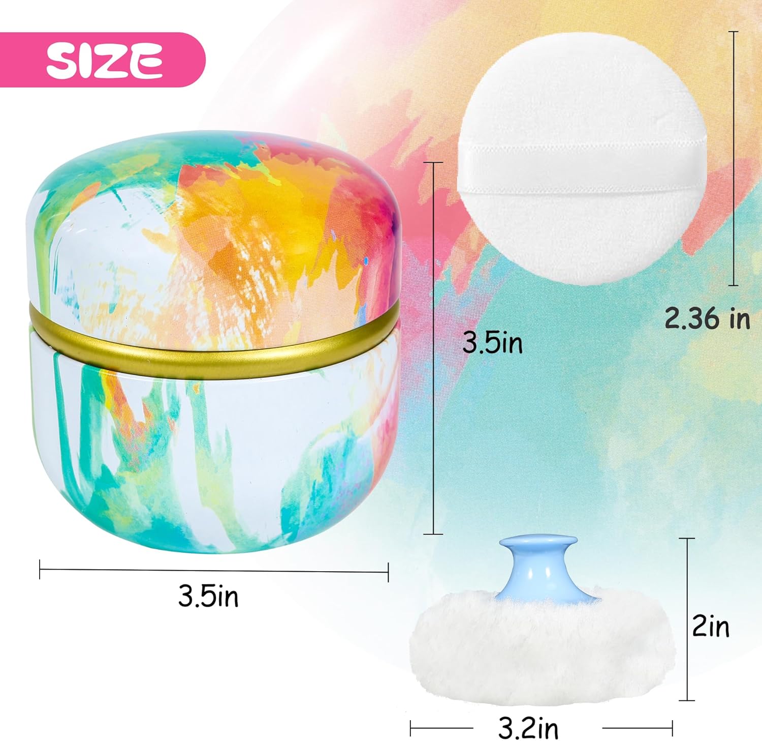 • Size: The powder box is 3.2" diameter/width.The powder puff is 3.15"/8cm in diameter and 2"/5cm in height.The small powder puff is 2.36"/6cm in diameter.