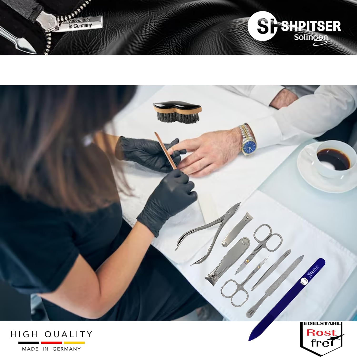• HANDMADE IN SOLINGEN GERMANY - SHPITSER Professional stainless steel manicure and pedicure tools are expertly crafted and hand-sharpened by skilled artisans. With a commitment to quality and precision, each tool is designed to deliver superior performance and durability.