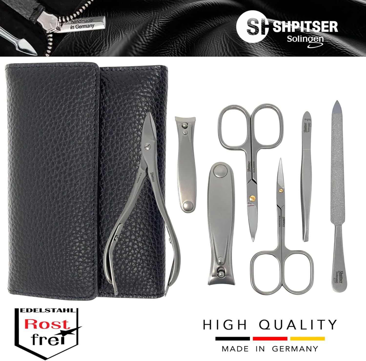 SHPITSER Professional 7pc TopInox Surgical Stainless Steel Tools Manicure Pedicure Set in Genuine Durable Leather Case Handmade in Solingen Germany for Nail and Cuticle Care