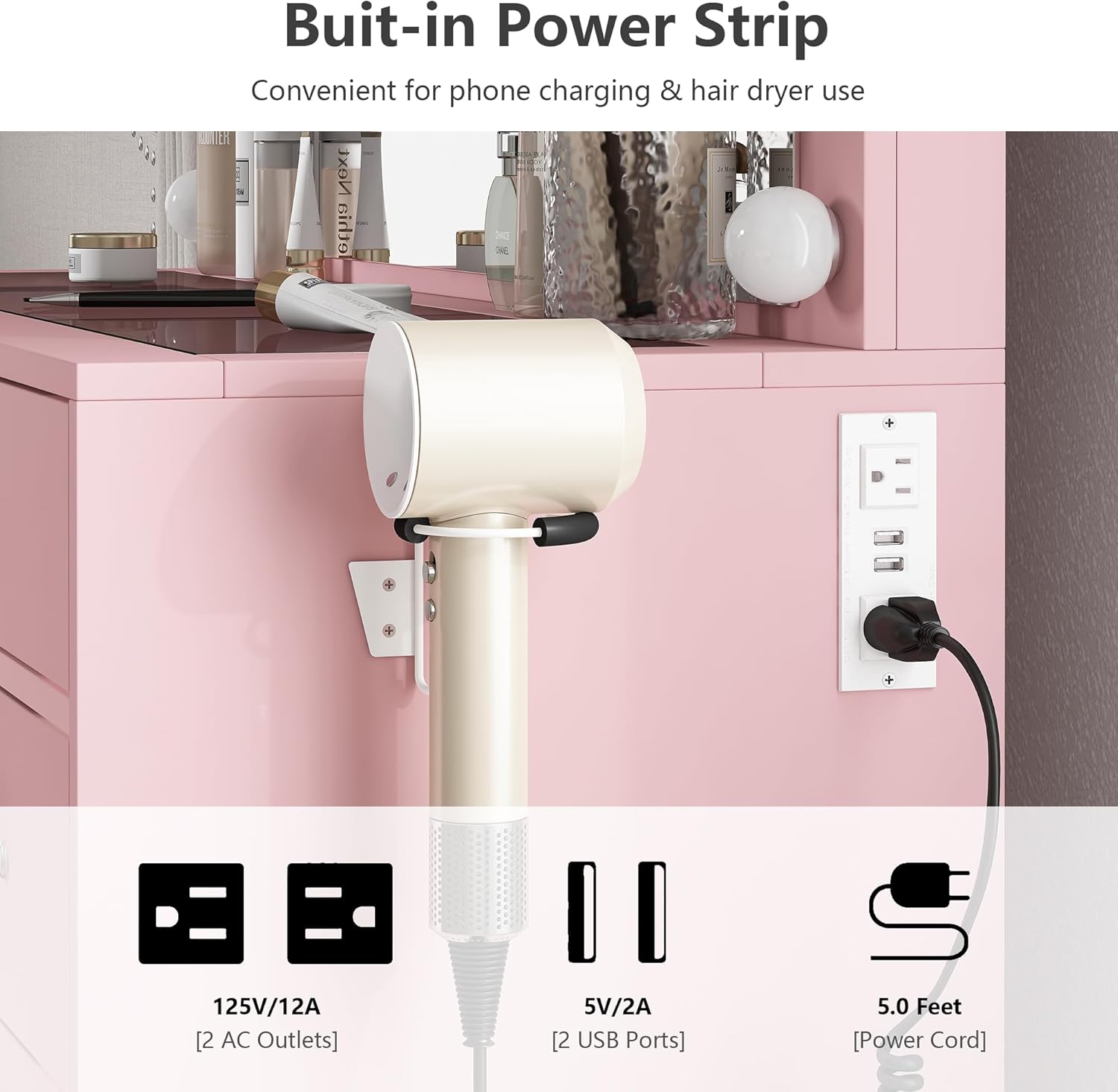 • Come with Power Outlet: This vanity table comes with a charging station and hair dryer holder, including 2 standard plug sockets and 2 USB ports. While using the dressing table, you can also connect your hair dryer, curling iron, phone, computer, and tablet