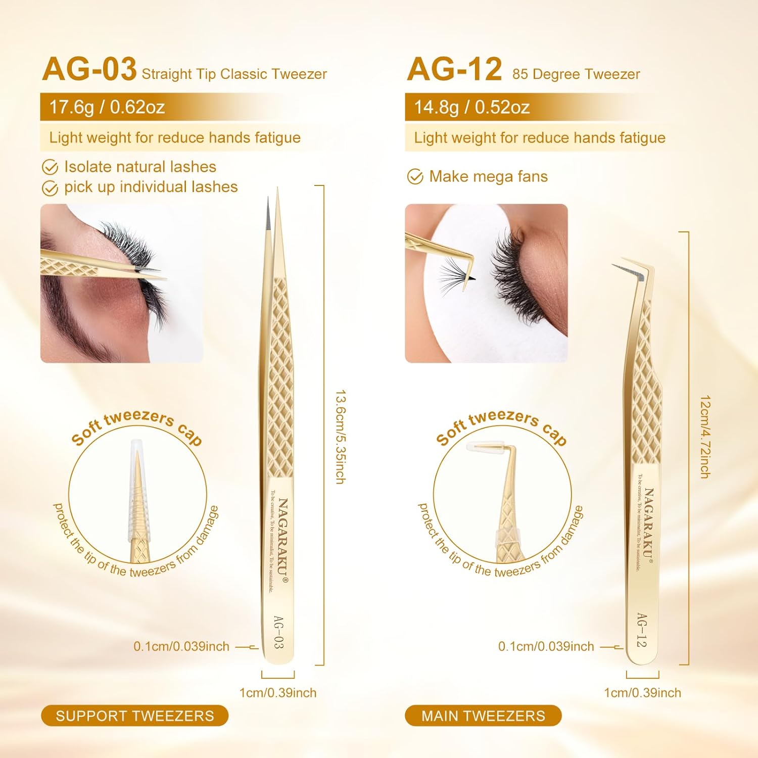 NAGARAKU Eyelash Tweezers, 1 Pair Precision Micro Fiber Tip Tweezer for Lash Extensions Antistatic Anti-Slip Pinzas with Box -Straight Tip & 85 Degree Long Tip Tweezers AG-03 & AG-012