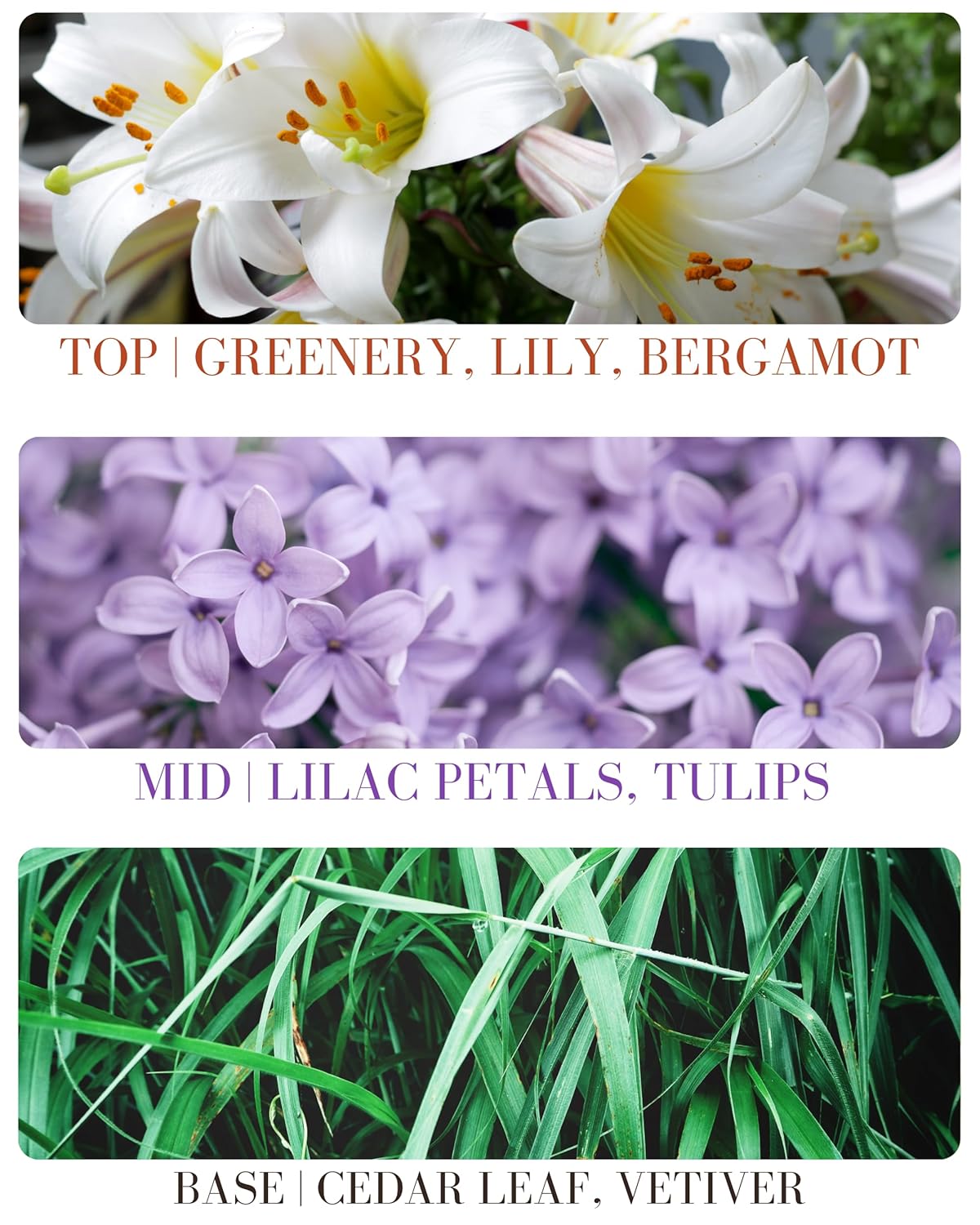 • SCENT PROFILE - TOP: Greenery, Lily, Bergamot MID: Lilac petals, Tulips BASE: Cedar leaf, Vetiver.