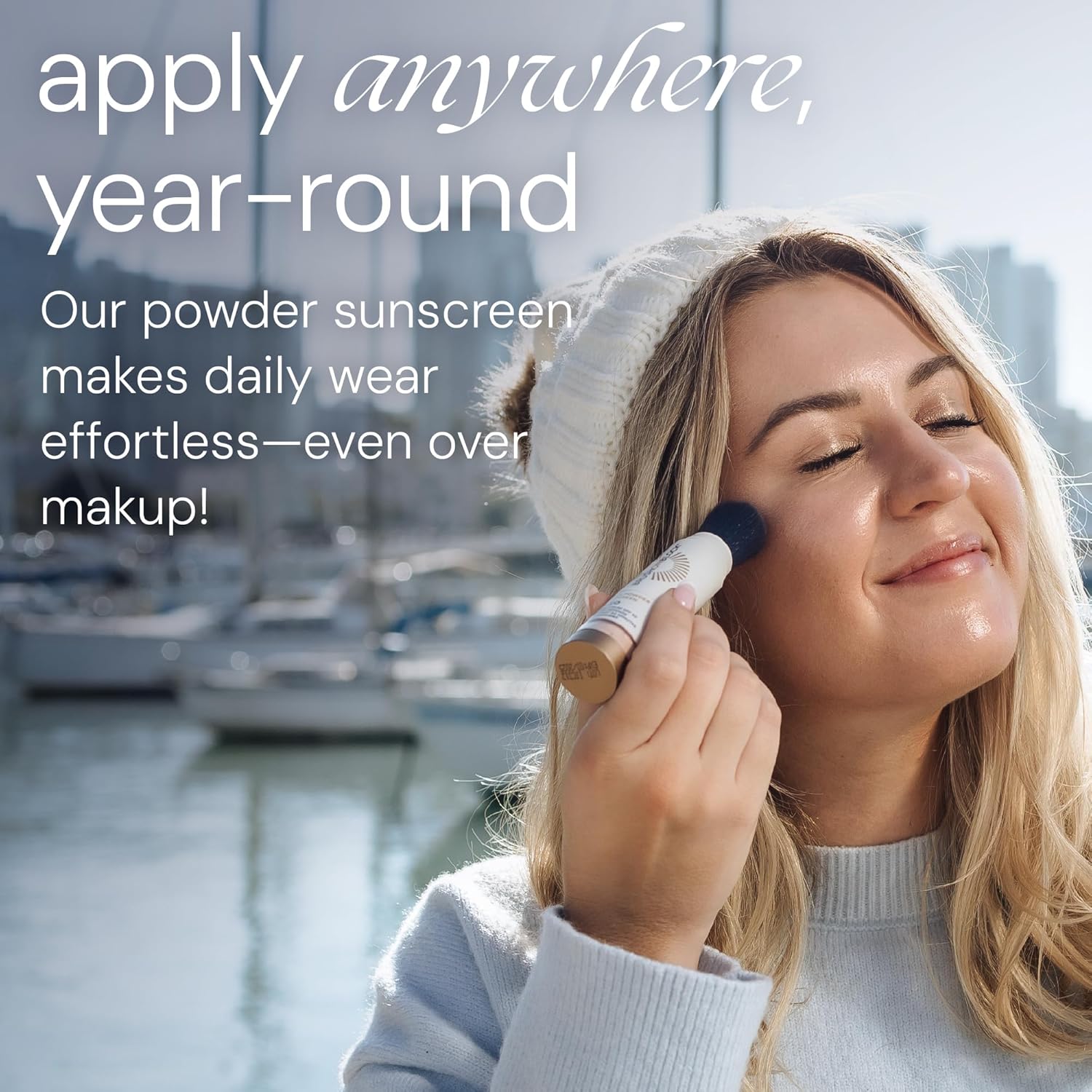 • EASY-TO-USE POWDER SUNSCREEN: A portable, self-dispensing brush containing mineral sunblock. The twist-open feature protects your bag while the SPF 50 mineral powder protects your face from harmful rays without the messy, greasy white residue of regular sunscreen