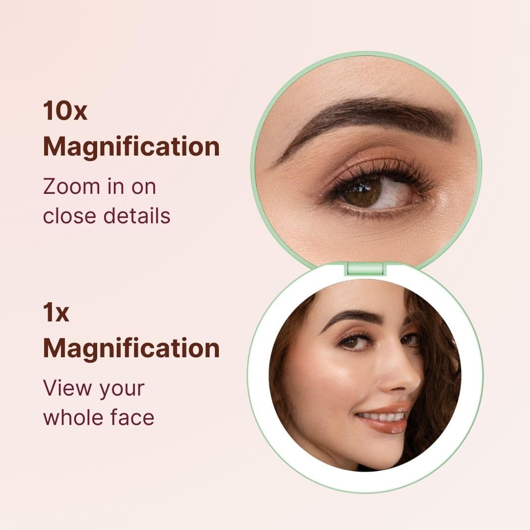 • Double-sided magnification (1x and 10x) so you can apply a full face of makeup, do a quick touch-up on the go, or focus on a detailed task like tweezing or inserting contact lenses