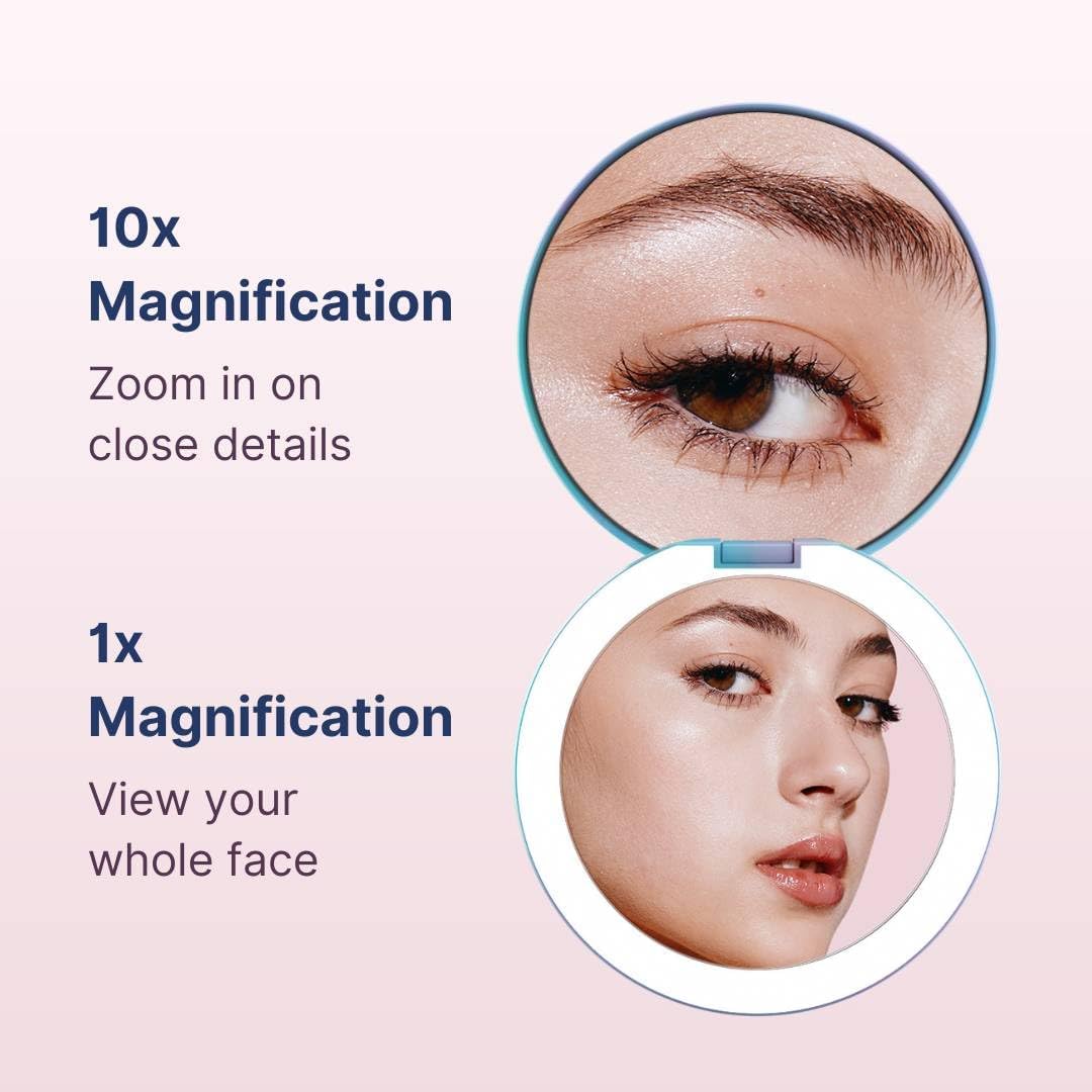 • Double-sided magnification (1x and 10x) so you can apply a full face of makeup, do a quick touch-up on the go, or focus on a detailed task like tweezing or inserting contact lenses