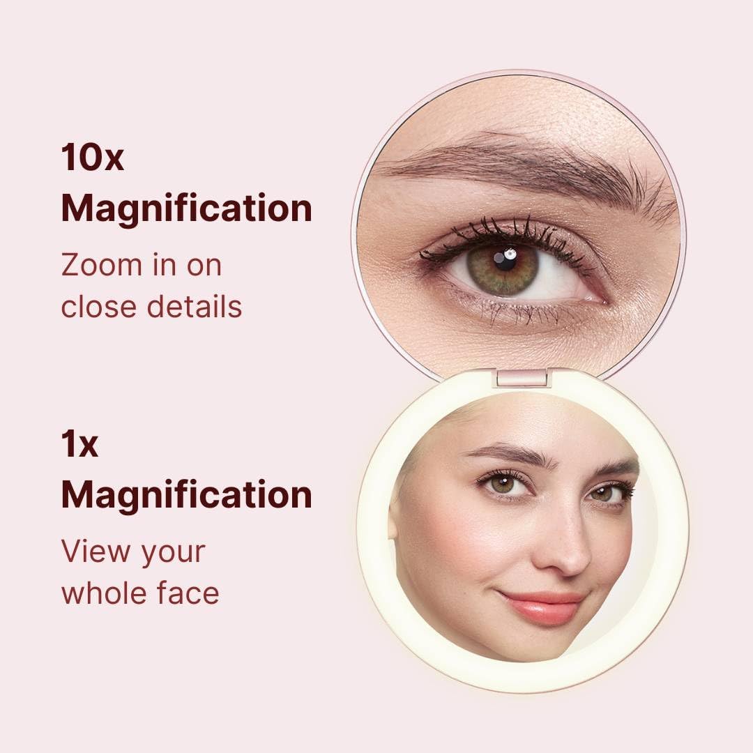 • Double-sided magnification (1x and 10x) so you can apply a full face of makeup, do a quick touch-up on the go, or focus on a detailed task like tweezing or inserting contact lenses