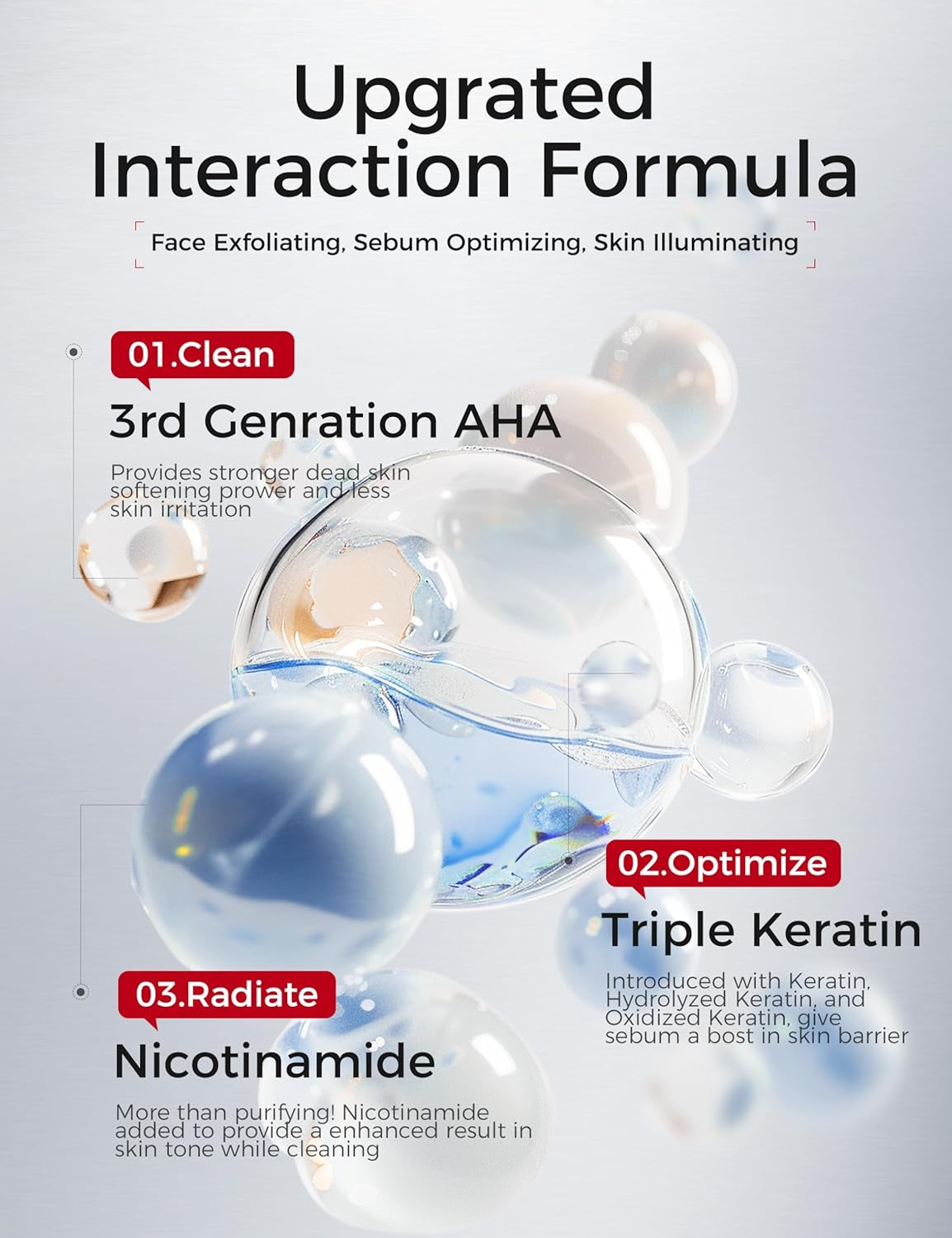 • SUPPORTS SKIN GLOWING & HYDRATION: Infused with niacinamide and three types of keratin, this face exfoliator helps maintain skin hydration while gently resurfacing. Unlike traditional exfoliating face wash, this formula exfoliates while nourishing, leaving skin feeling soft, balanced, and healthy. Niacinamide & plant extracts help reduce dark spots, promote even skin tone, and enhance skin clarity, giving you a radiant glow