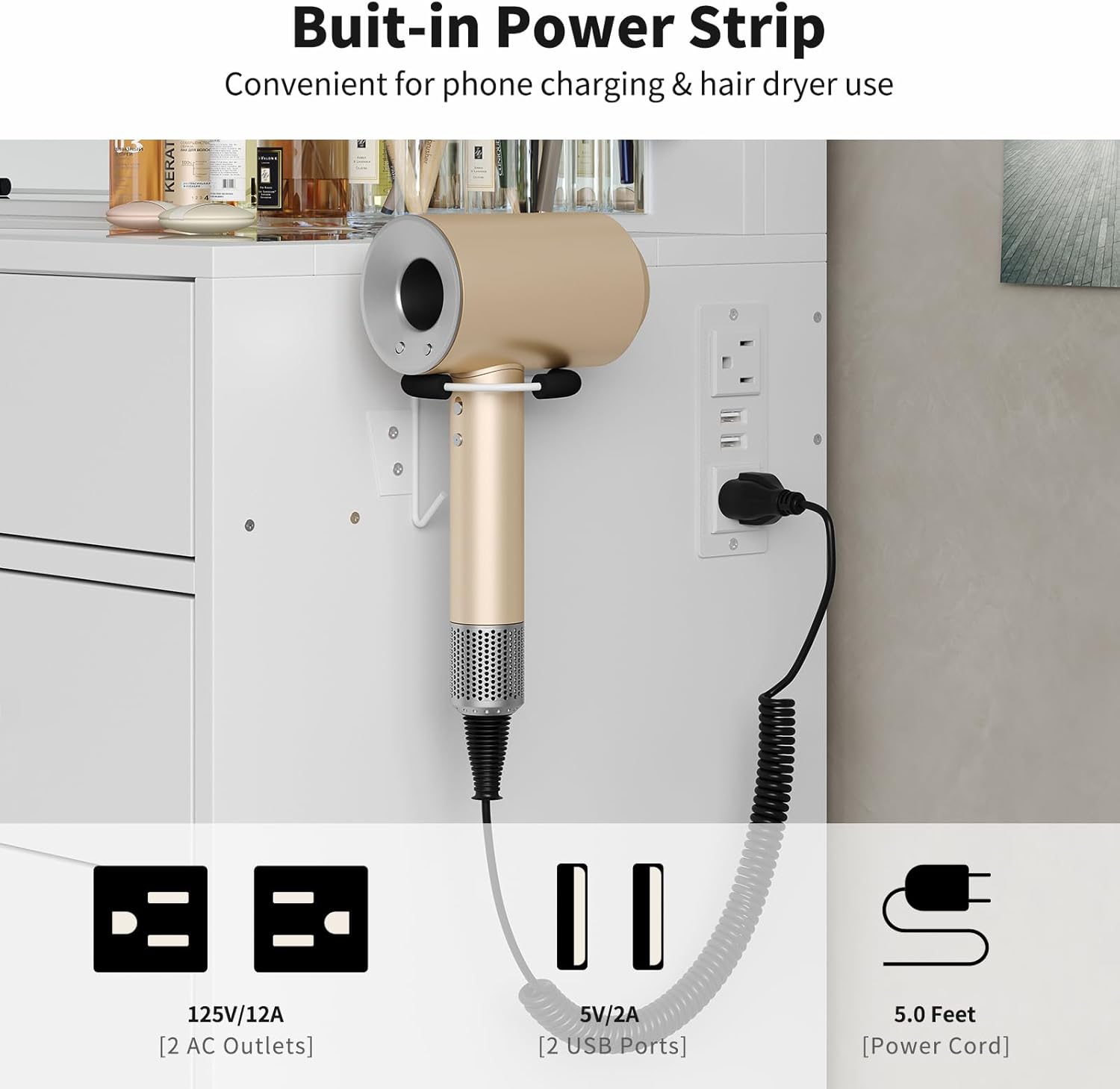 • Convenient Power Station:Stay charged and connected with the built-in power outlet, featuring a dedicated hairdryer rack along with 2 standard plug sockets and 2 USB ports. This makeup vanity allows you to power up your devices or styling tools while you effortlessly create your perfect look