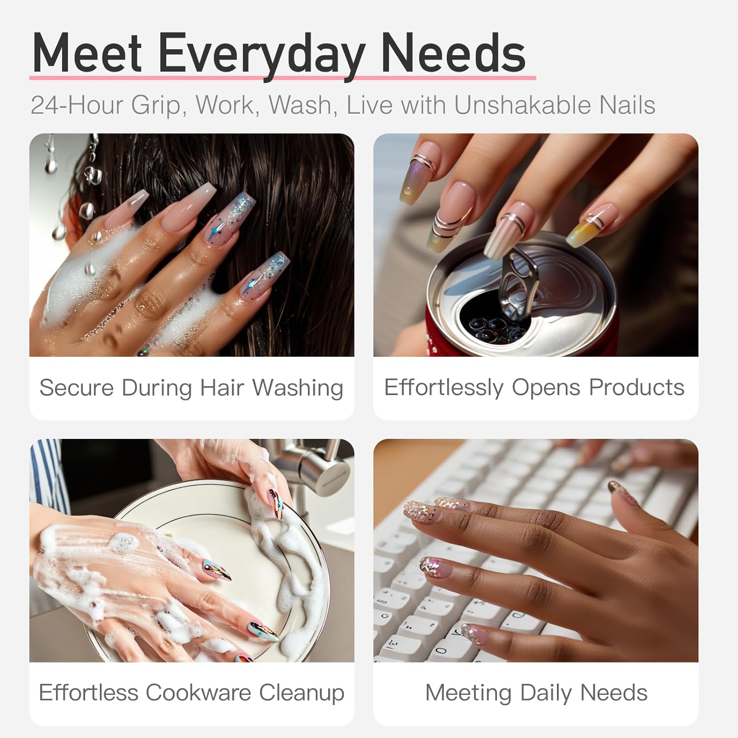 • Strong Bonding for Daily Life:Formulated for durability, this semi-solid nail glue creates a powerful bond that fully sets within one hour. Once affixed, it withstands water exposure and daily activities—whether you're washing dishes, working out, or simply living your busy life, your nails stay flawless