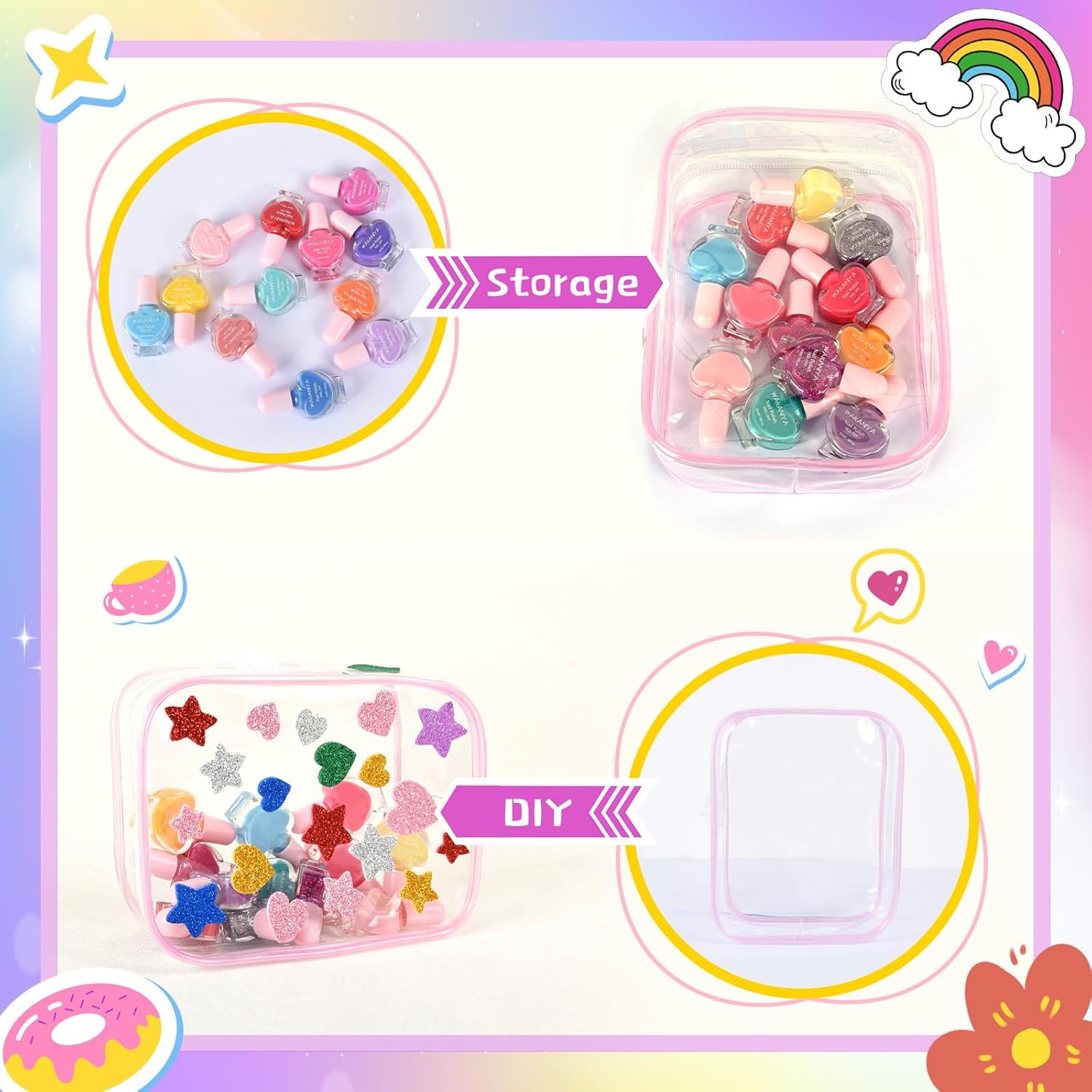 • Complete Kids Nail Polish Set: This deluxe kids nail polish set for girls includes 12 vibrant colors in adorable 5ml mini nail polish heart-shaped bottles, plus a precision nail art brush, fun DIY stickers, and a transparent PVC storage bag. The durable bag keeps everything organized and mess-free, preventing lost bottles.
