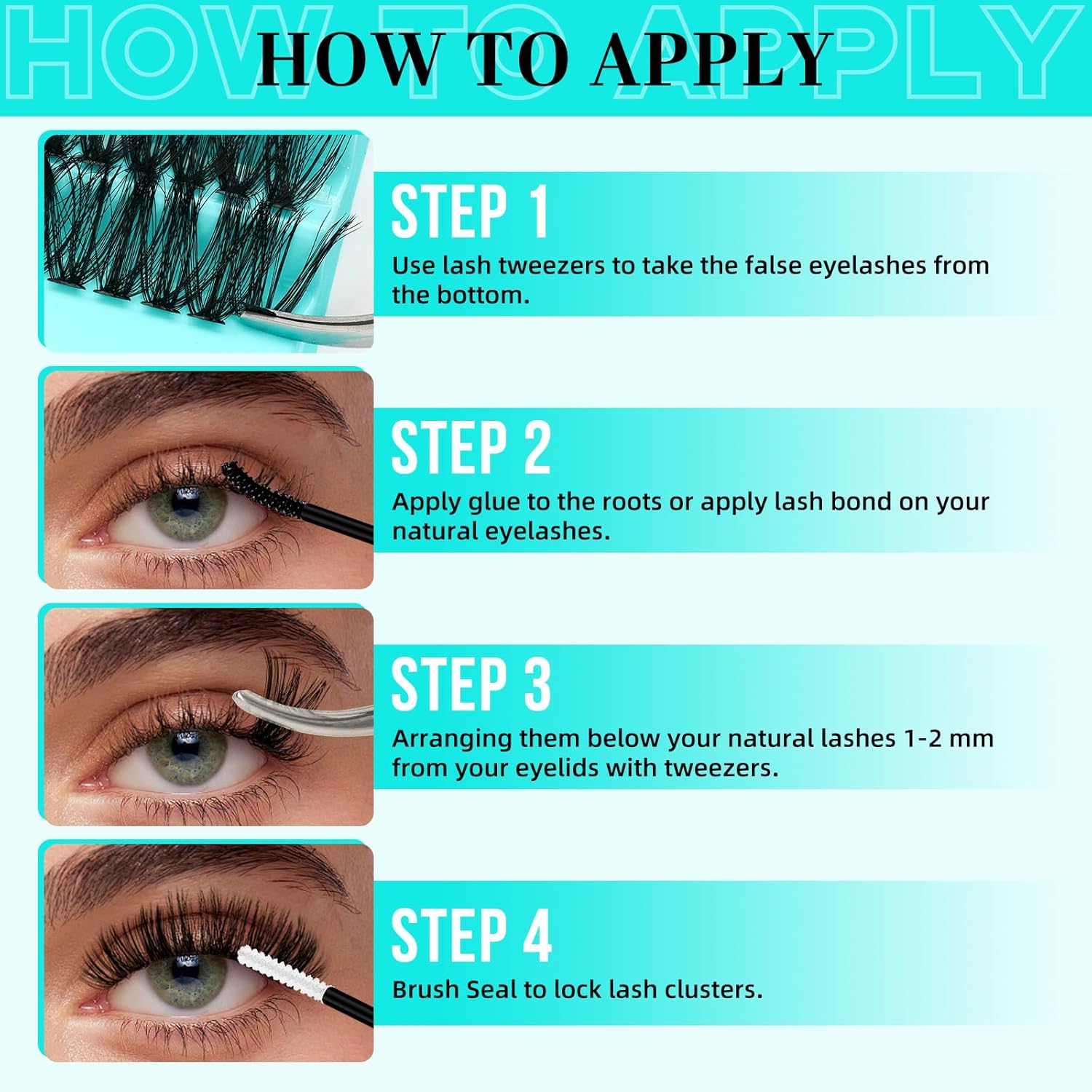 • Easy to Apply:Curl your lashes first,apply glue to the roots or apply lash bond on your natural eyelashes.Use lash tweezers to take the false eyelashes from the bottom.Match the wispy lash clusters to suit your style,arranging them below your natural lashes 1-2 mm from your eyelids,finally,use lash seal brush to lock.By 3 steps-bond,apply,seal,anyone can get stunning results.