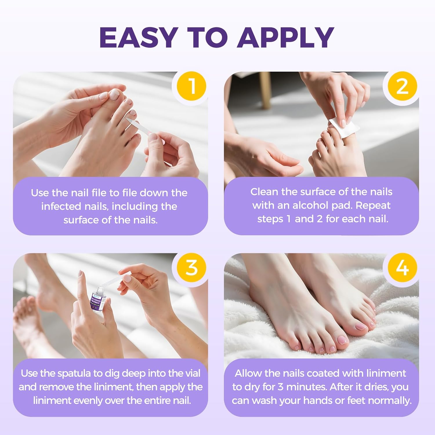• Easy to Use: Simply file down the nail with a nail file, then apply toenail treatment liniment to the nail. For best results, use 1-2 times a week and see noticeable improvements in just 2-4 weeks