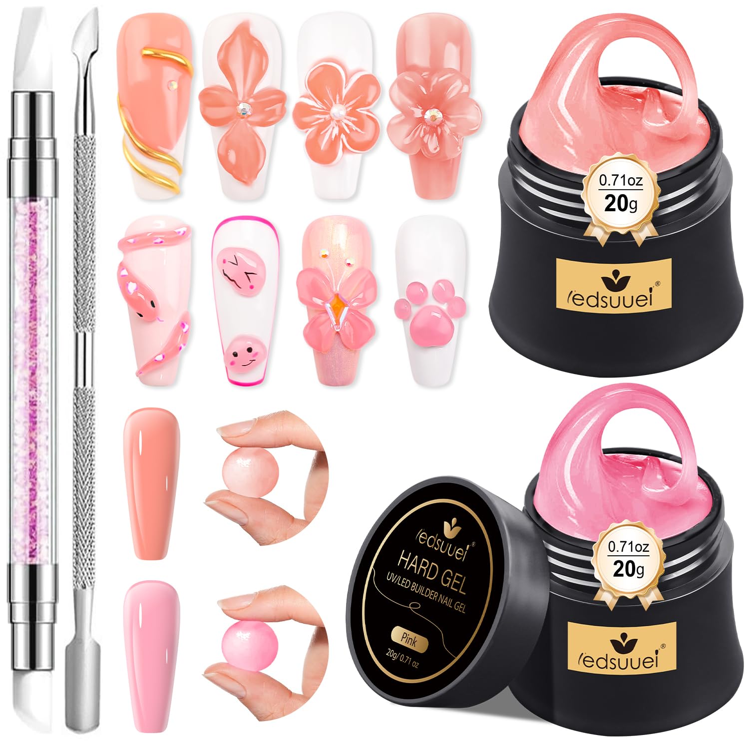 • Beginners Solid Builder Gel: This hard sculpting gel for nails set includes 20g*2 color gel (nude and pink), 1*silicone smear pen and 1*steel pusher, perfect for beginners and nail art lovers, this 3d builder gel set allows you to easily create amazing 3D manicure designs at home.