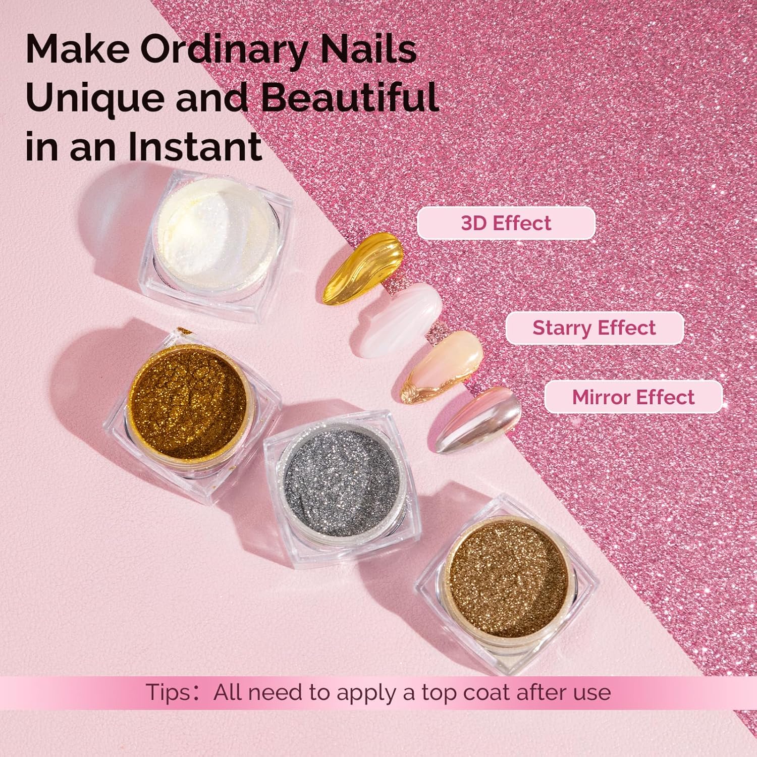 • Wide Range of Applications: Suitable for UV gel nails, acrylic nails,natural nails or false nails.Easy to get a salon grade chrome effect without special techniques.Powder is easy to apply and suitable for beginners