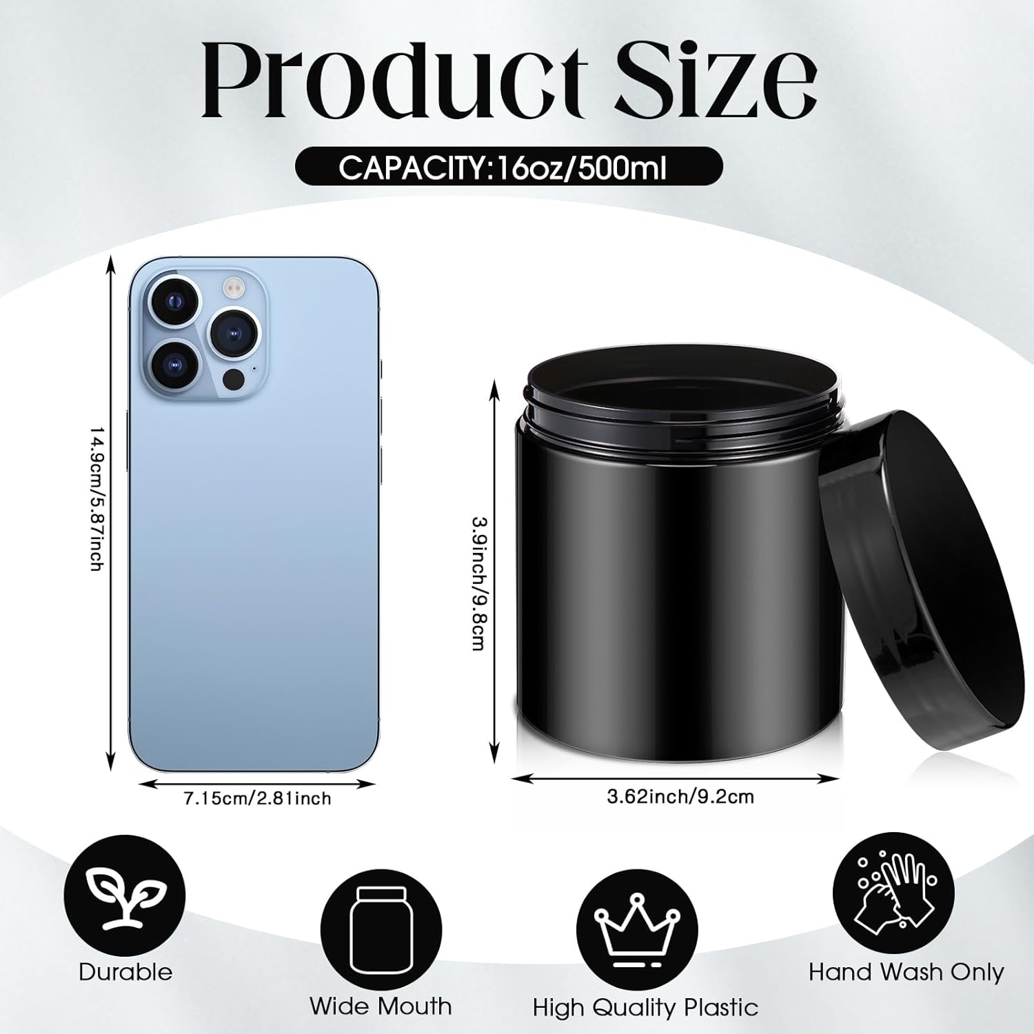 • What You Receive: there are 4 pieces plastic jars with black screw-on lids; They are durable and refillable, measuring about 16 oz in capacity