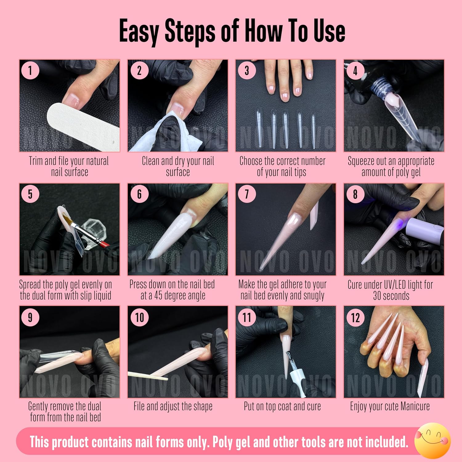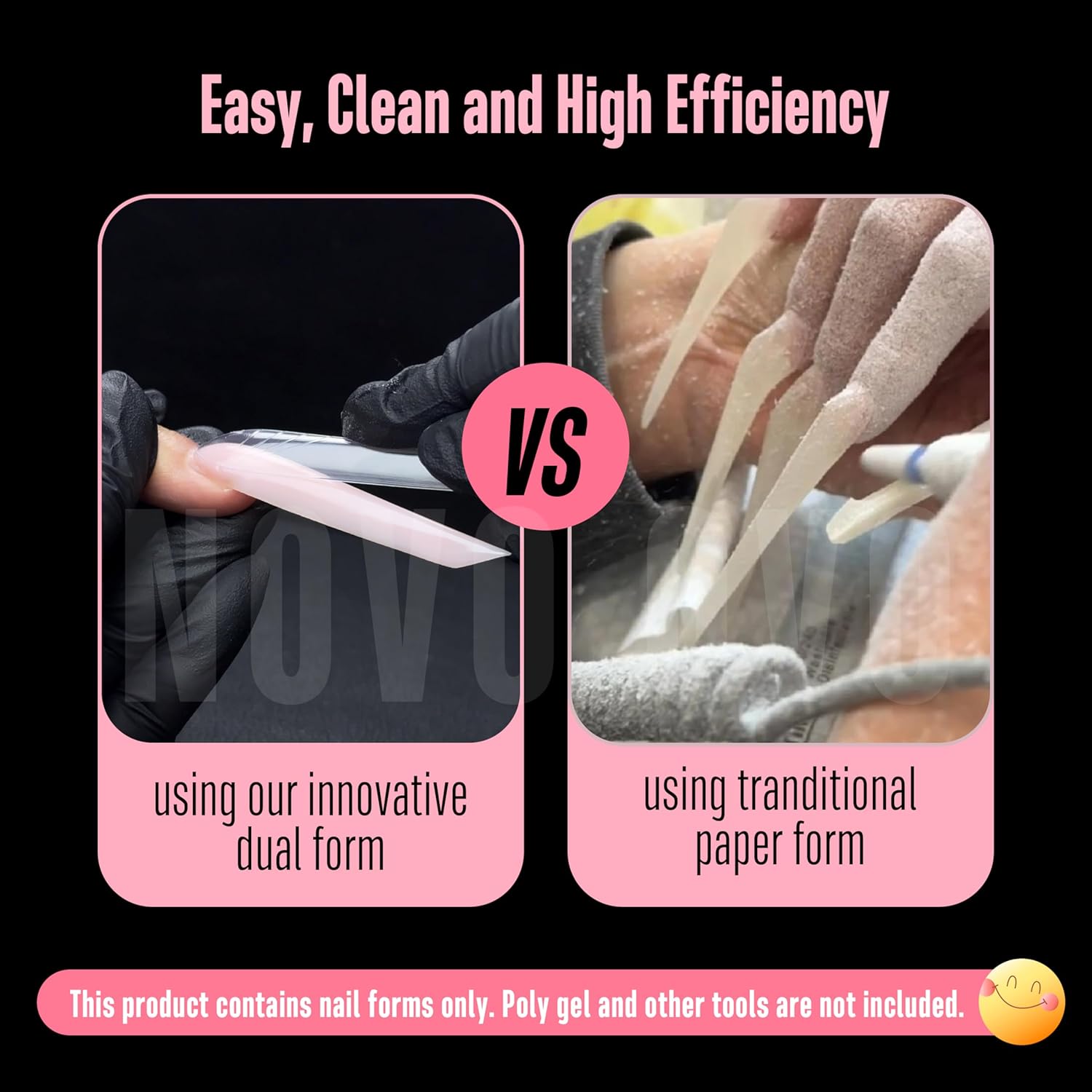 • THE WORLD'S FIRST XXXL OR XXXXL RUSSIAN ALMOND DUAL FORM: At the demand of our clients—nail artists and DIY enthusiasts who embrace the latest trends—NOVO OVO is excited to unveil this innovative Super Long Russian Almond dual form. Effortlessly create stunning nails that are ideal for holiday parties and spooky festivities by filling the forms with poly gel, harder gel or builder gel positioning them on your nail, curing, and simply popping them off for a flawless 3D astonishing finish.