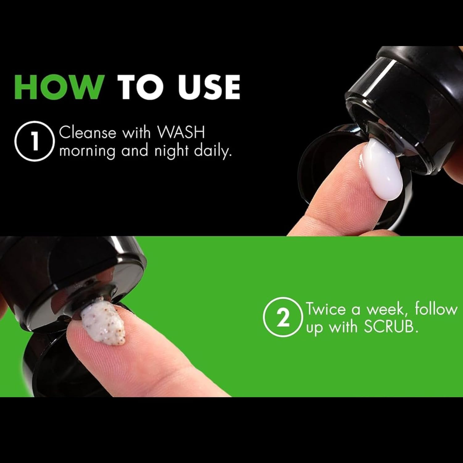 • How to Use: First, rinse your face with some warm water. Squeeze a nickel-size amount of WASH onto your fingers. Briefly rub your hands together to spread it out, then gently apply it all over your face for 10-15 seconds, avoiding your eyes and mouth. After cleansing, rinse off with more water. Use once in the morning and at night. Twice a week, after washing your face, squeeze a nickel-size amount of SCRUB onto your fingers. Gently apply it all over your face, making sure to avoid your eyes and mouth. Spend about 10-15 seconds exfoliating your skin, then rinse off with warm water.