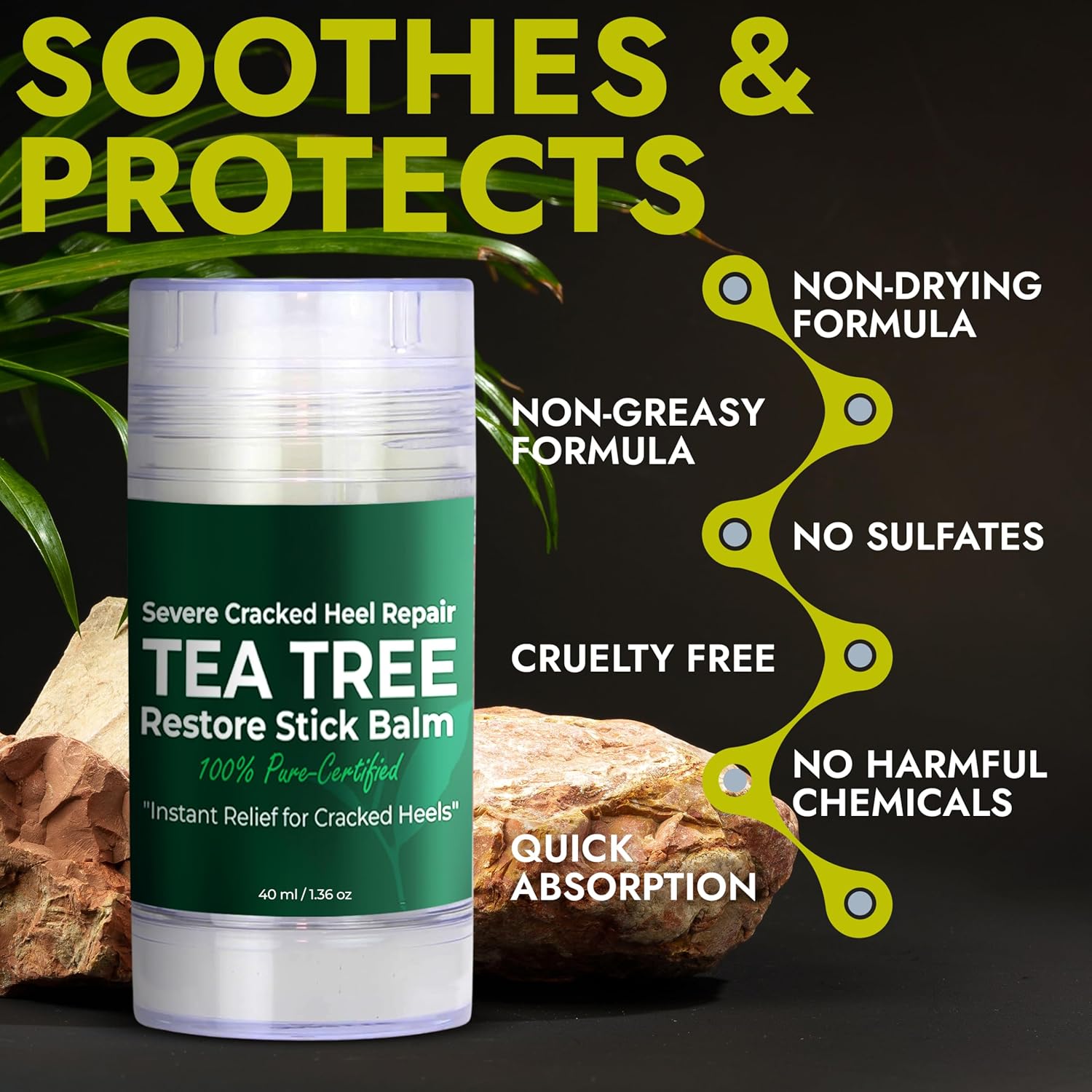• Tea Tree Oil Power: This foot balm stick for dry cracked feet for cracked heels hydrates, repairs, and restores even the toughest skin. Its natural antibacterial properties soothe irritation, fight odor, and keep your feet feeling fresh, clean, and protected daily.