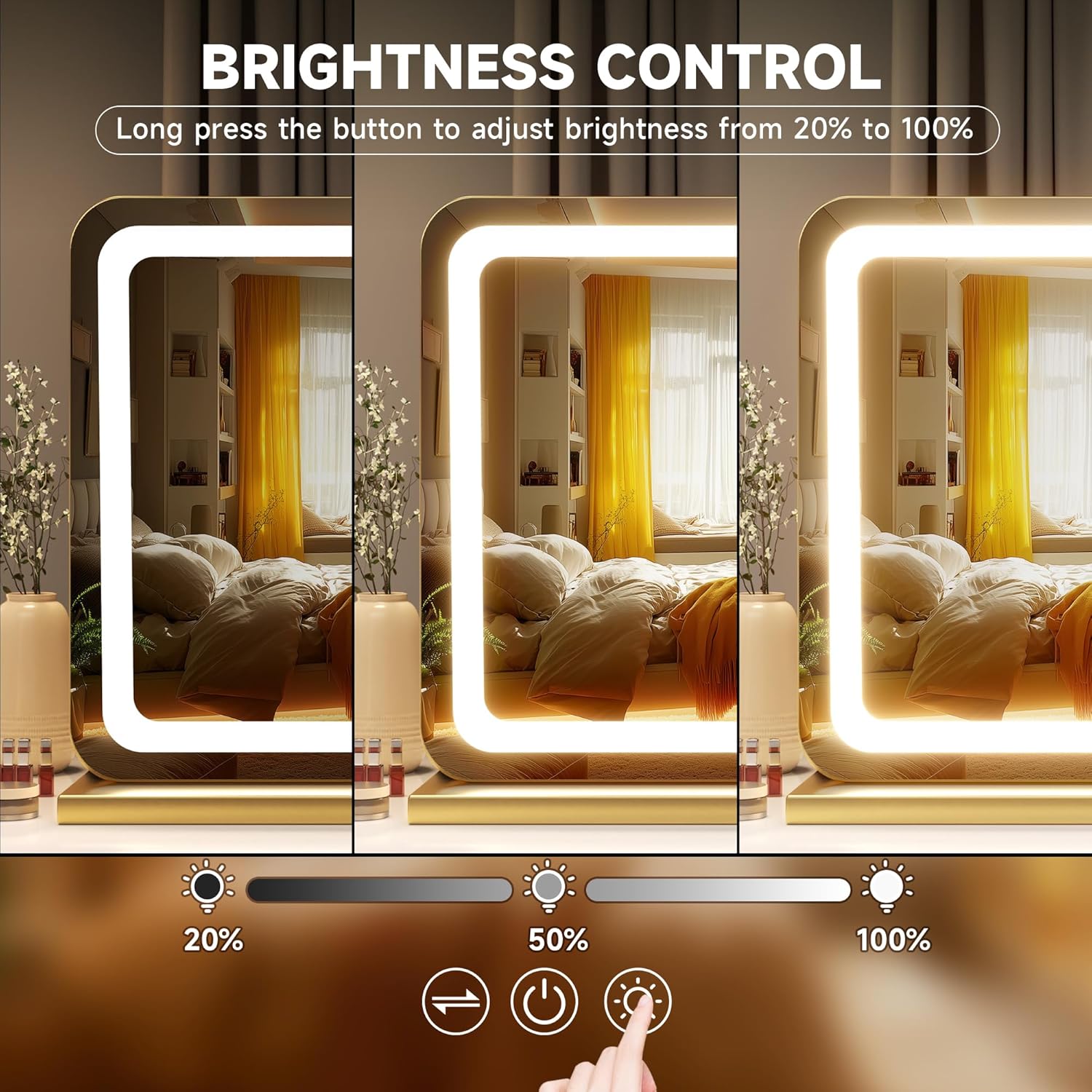 • 👍【Smart Touch Control & Memory Function】This makeup mirror with lights has 3 smart touch buttons, turn on/off the light by touching the sensor switch, Press left button to change the color modes, long press right button to adjust the led brightness. This lighted makeup mirror is specially designed memory functionfunction keep your lights setting like your last use.