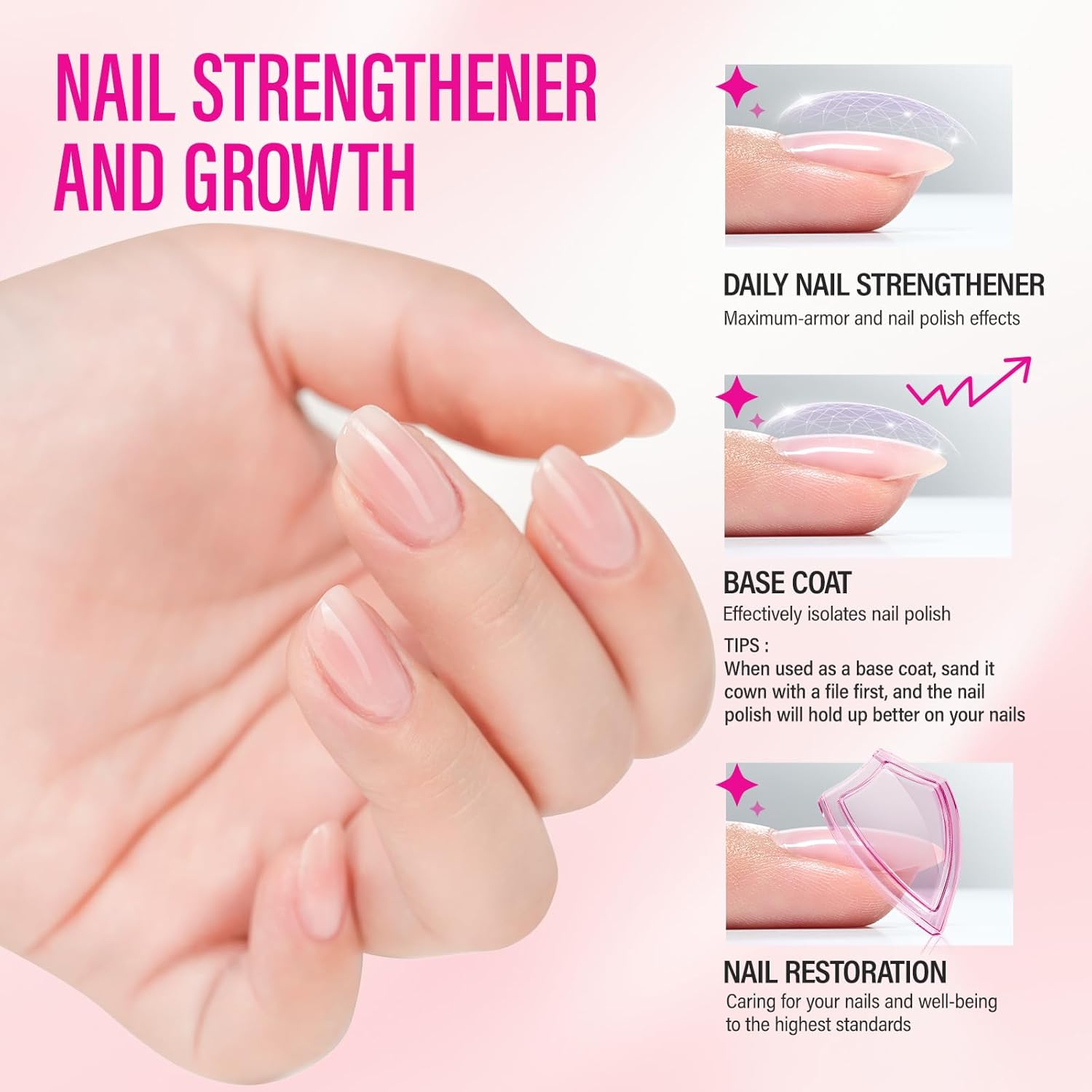 • Transform Your Manicure with Our 8-in-1 Nail Strengthener: Experience the ultimate nail care with our updated formula that combines Nail Protein Strengthening, Base Coat, Nail Ridge Filler, Nail Repair, Quick-Drying, and Nail Polish in one bottle. Perfect for most nail types, this versatile solution simplifies your nail routine and enhances any nail art design effortlessly with a soft, warm pink with a hint of peach.
