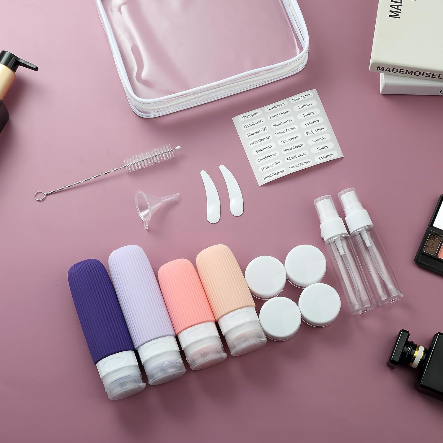 • Useful Travel Accessories: This is a nice assortment of travel containers in a useful zip case. ( Come in 4 Travel Bottles+4 Travel Jars+2 Spray Bottles+2 Scoopers+1 Funnel+1 Clean Brush + 1 Page Label + 1 Clear Toiletry Bag ) Multiple ones allow you take along different beauty products and toiletries according to your requirement