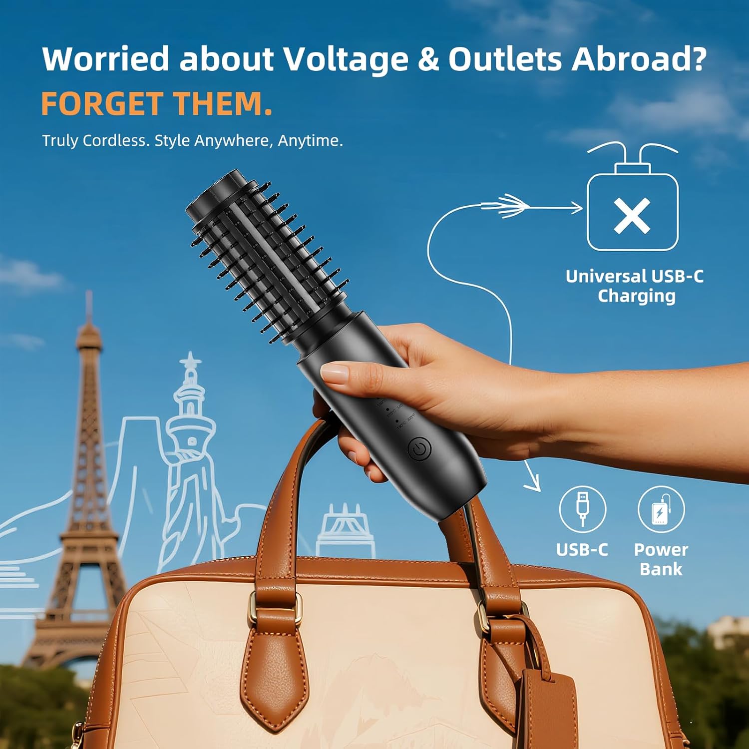 • 【Your Cordless Travel & Gym Companion】 Free yourself from outlets and tangled cords. A compact, TSA-friendly heated round brush is a new travel essential. Fully cordless with universal USB-C charging, it’s ready for a weekend getaway, international trip, or post-workout glam-up. Experience the freedom of flawless hair, anywhere.