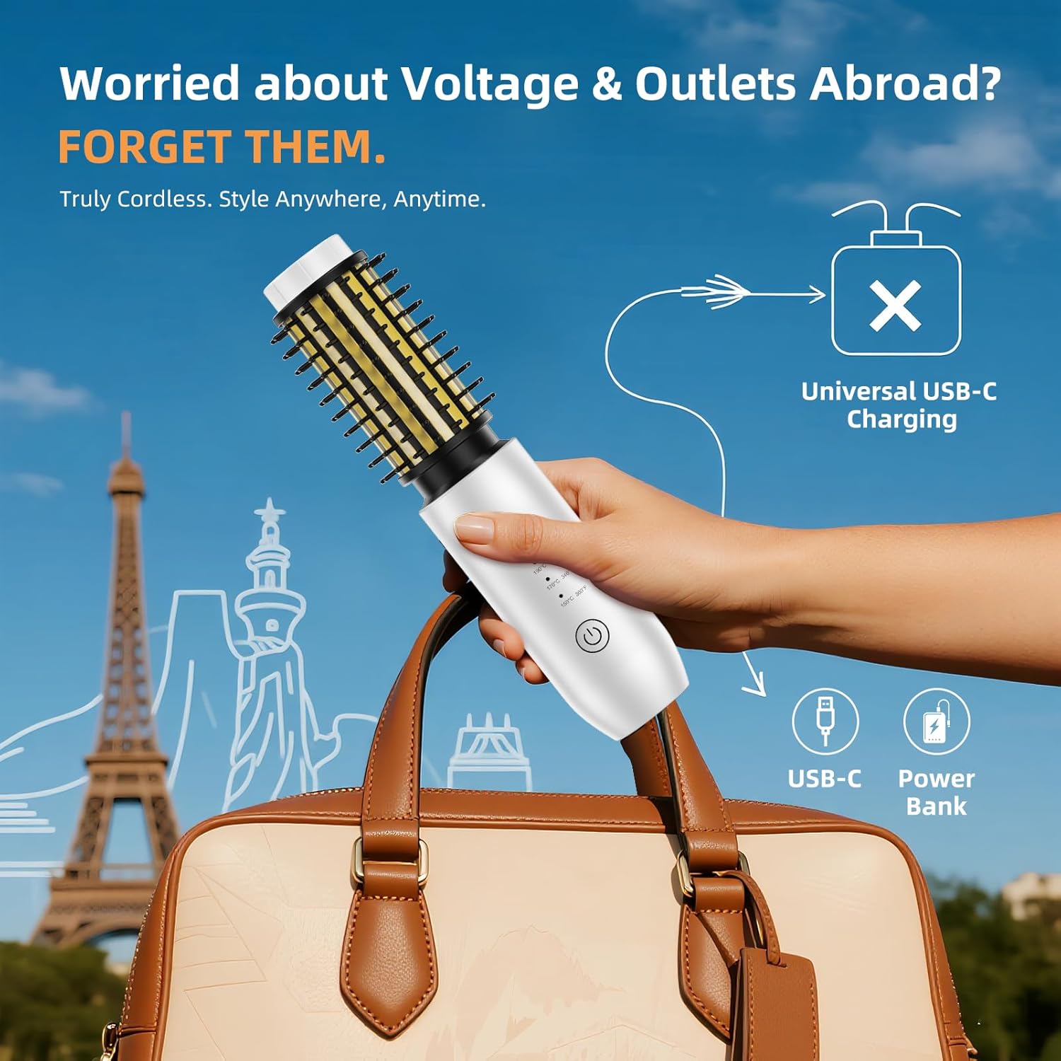 • 【Your Cordless Travel & Gym Companion】 Free yourself from outlets and tangled cords. A compact, TSA-friendly heated round brush is a new travel essential. Fully cordless with universal USB-C charging, it’s ready for a weekend getaway, international trip, or post-workout glam-up. Experience the freedom of flawless hair, anywhere.