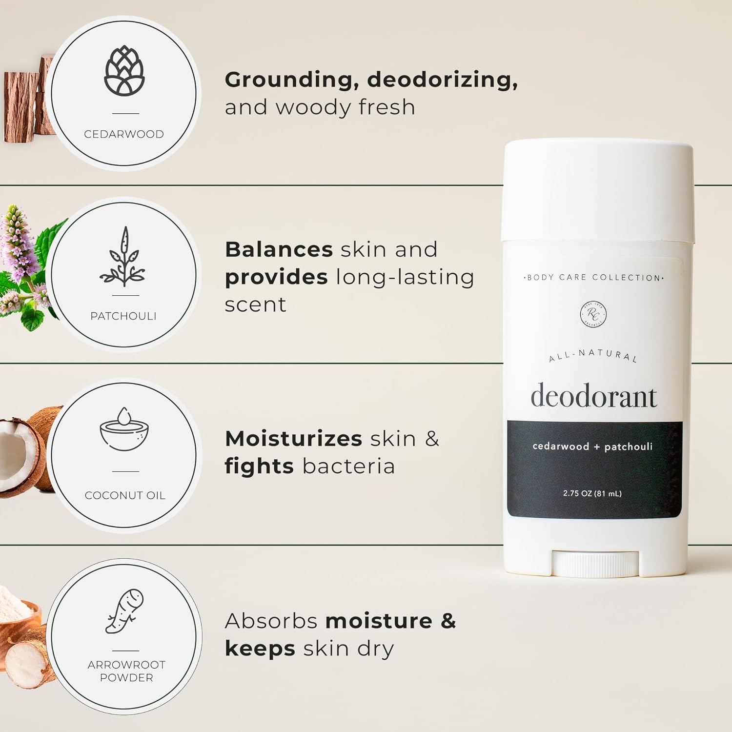 • Infused with Essential Oils: Crafted with cedarwood and patchouli, this men’s natural deodorant has an earthy, woody, slightly sweet scent. Cedarwood promotes calmness, while patchouli’s musky aroma provides warmth and balance for all-day freshness.