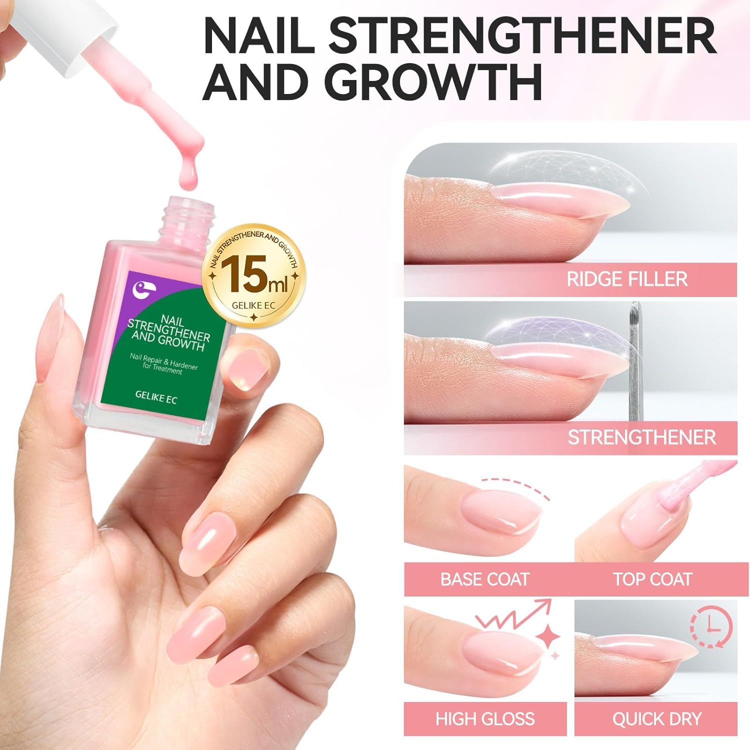 Nail Strengthener Protein for Damaged Nails: Pink 15ml 6 in 1 Natural Nail Hardener Extra Strong and Growth - Long Lasting Repair for Damaged Nails - Growth Oil for Salon Home Daily Work