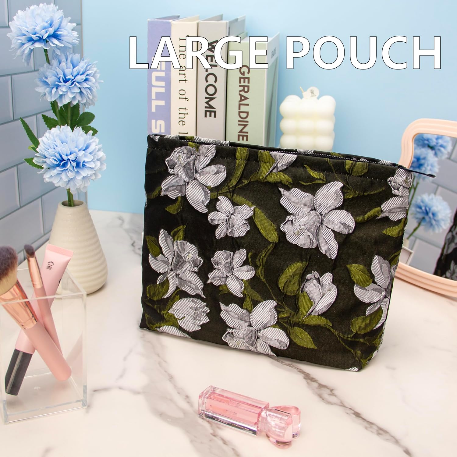 PAZIMIIK Makeup Bag Large Cotton Zipper Pouch for Purse Travel Canvas Make Up Organizer for Women Cosmetic,Brocade Floral Black