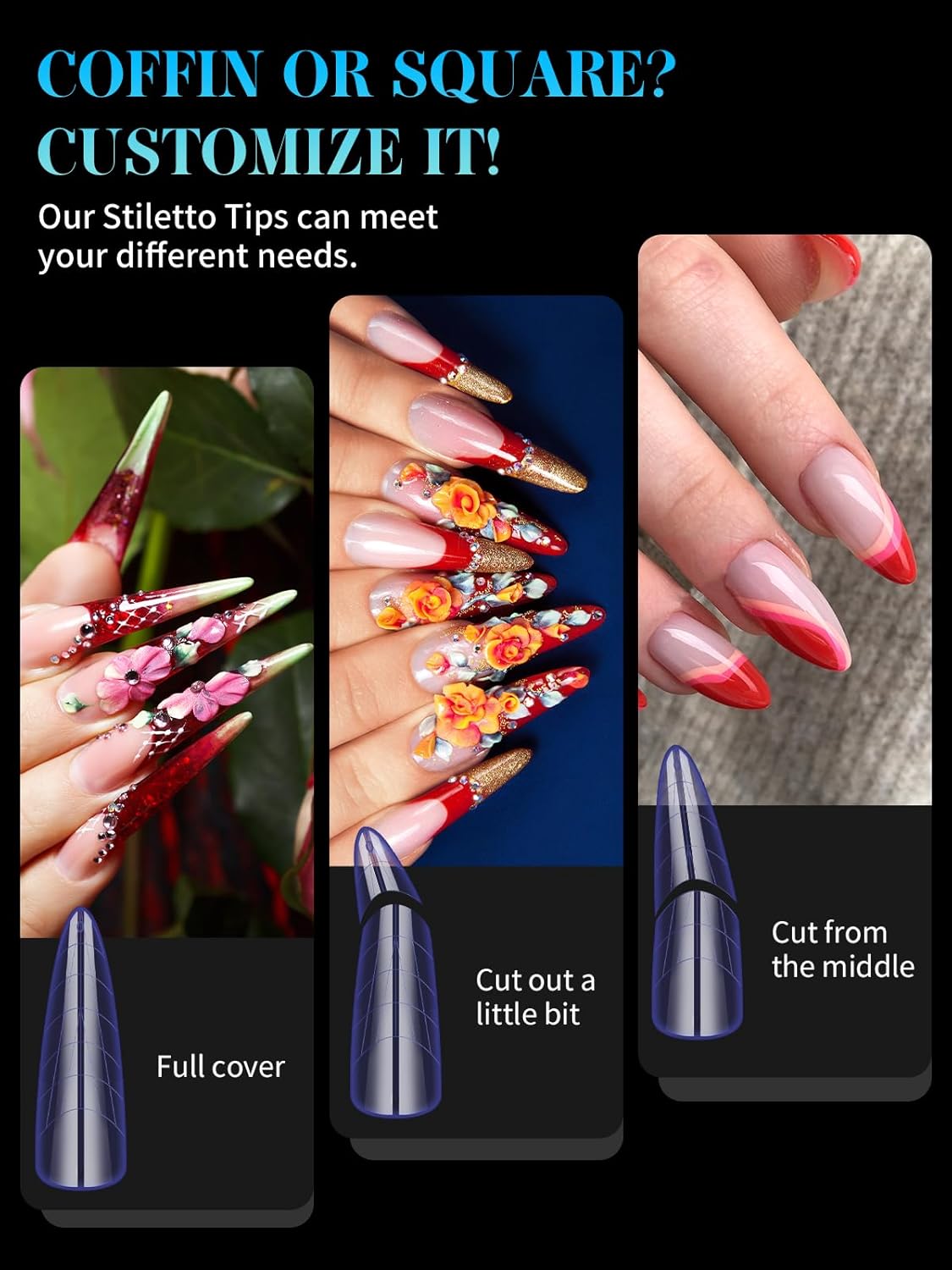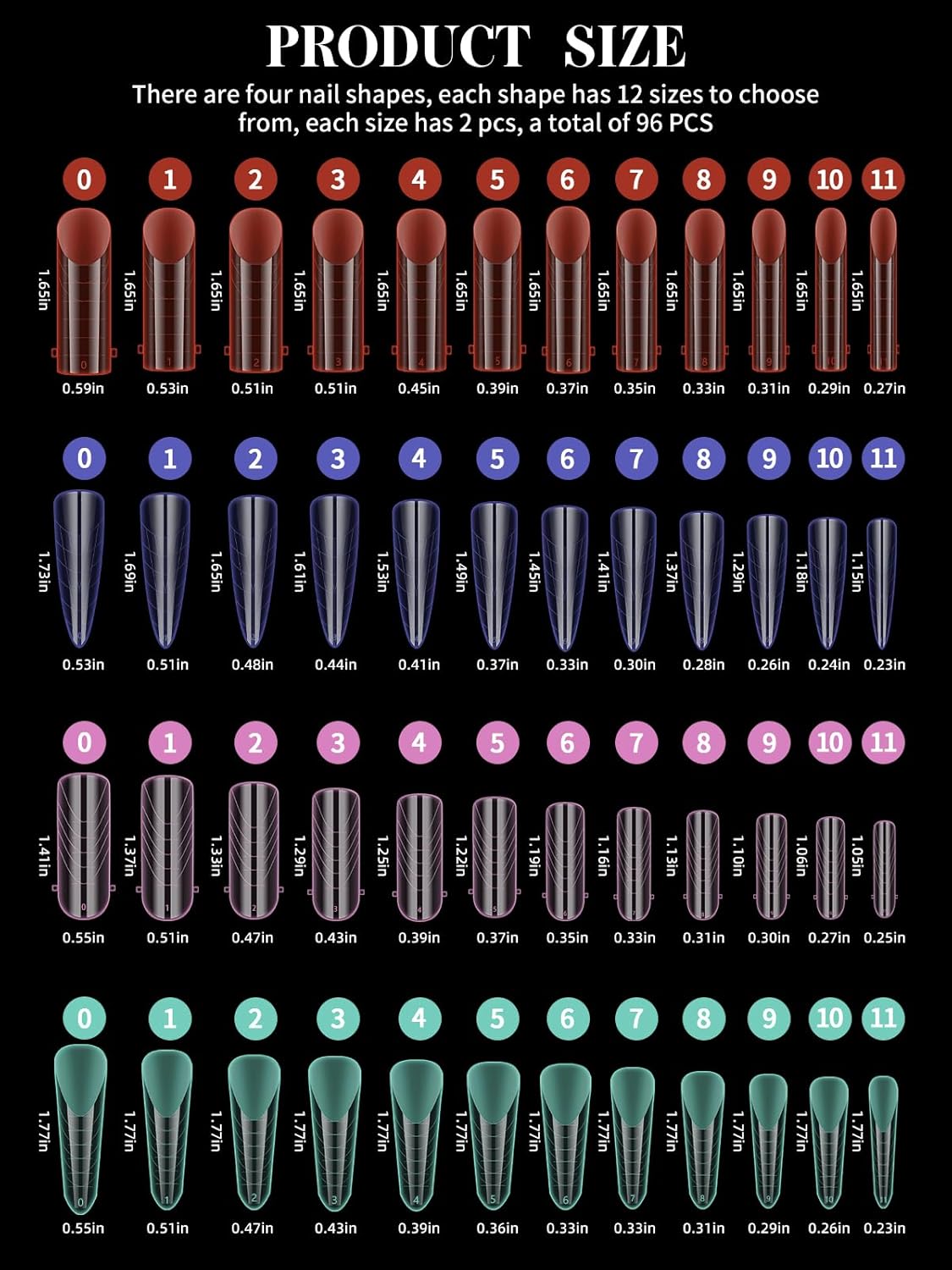 • 【Nail Form Mold with 12 Sizes】96pcs stiletto clear dual forms for poly nail gel offers 12 different nail sizes , and each size of long nail tips is separated by a small grid, a total of 12 grids, so they're easy and convenient to choose the suitable size to meet your nail's need.