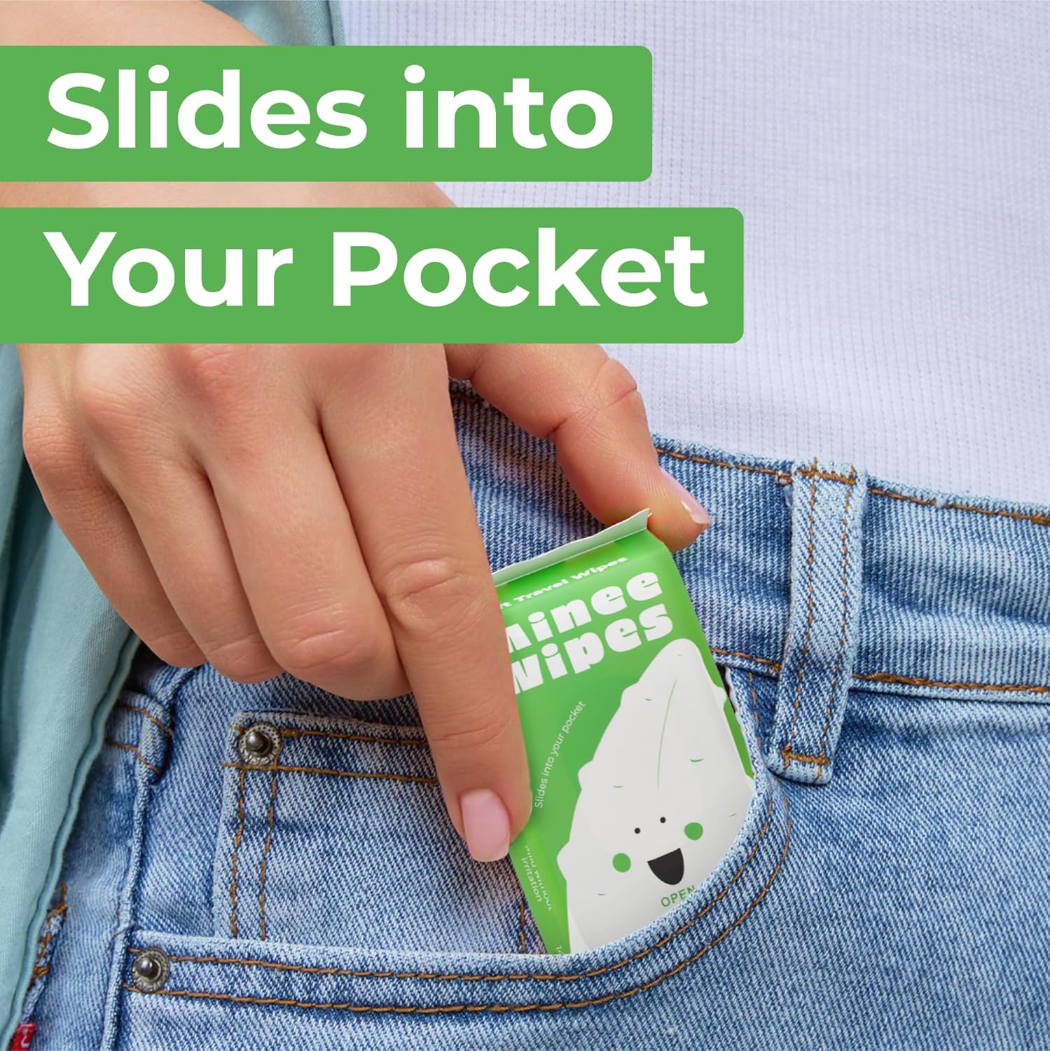 • 💚COMPACT CREDIT CARD SIZE: Minee hand wipes are designed to be as compact as a credit card, making them perfect personal wipes for any occasion. Having 6 wipes in each small bag, these hand and face wipes are ideal wipes for adults and kids, offering a convenient hygiene solution that fits effortlessly into your wallet or purse.