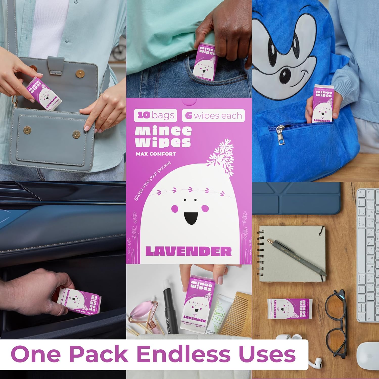 • 💜COMPACT CREDIT CARD SIZE: Minee hand wipes are designed to be as compact as a credit card, making them perfect personal wipes for any occasion. Having 6 wipes in each small bag, these hand and face wipes are ideal wipes for adults and kids, offering a convenient hygiene solution that fits effortlessly into your wallet or purse.