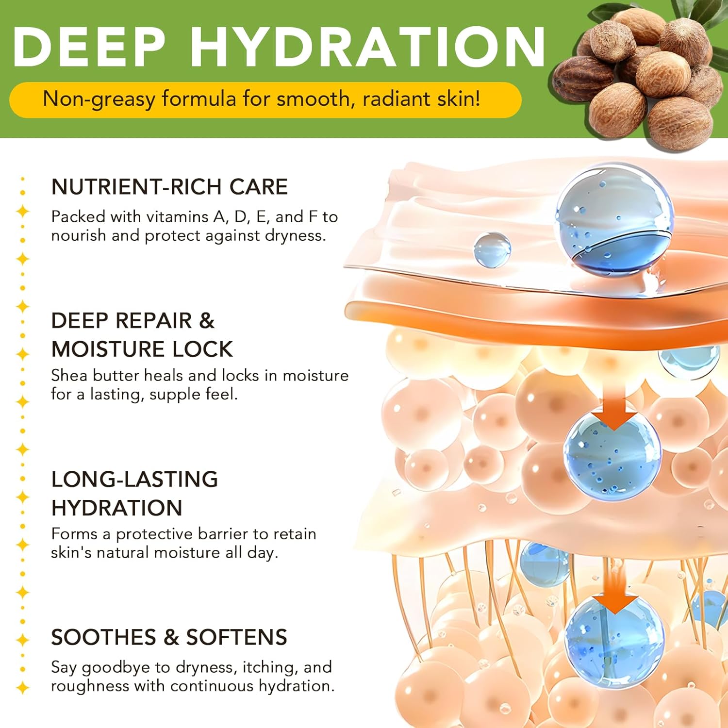 • Ultra Hydration : Shea butter lotion has super moisturizing abilities, locking in moisture, deeply hydrating and revitalizing, leaving skin soft and elastic.