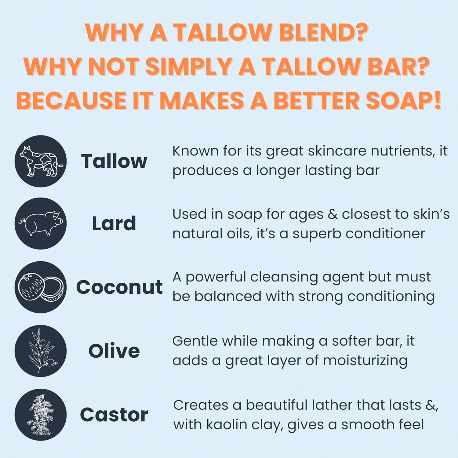 • RICH TALLOW BENEFITS: Crafted with pure grass fed tallow—known to be rich in vitamins, anti-inflammatory, and antimicrobial benefits—blended with gentle lard and premium plant oils for a nourishing lather that outperforms vegan-only bars.