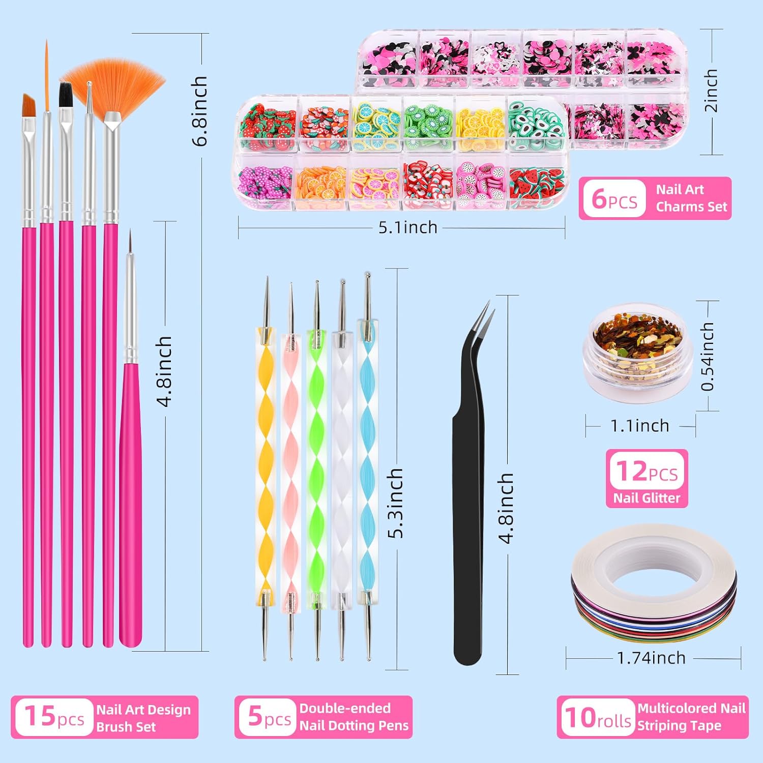 • Nail Art Decoration Kit: You will receive a nail art charms set, it contains 15pcs nail art brushes, 5pcs dotting pens, 10 colors of striped tape, 1 box 12 colors of nail art sequins, 5 boxes of mixed nail art glitters (flowers, butterflies, stars, love hearts, circles), 1 box fruit shaped slime pieces, and a pair of tweezers. This complete nail art set is perfect for nail art beginners and enthusiasts, it's easy to start a pleasurable nail art salon at home.