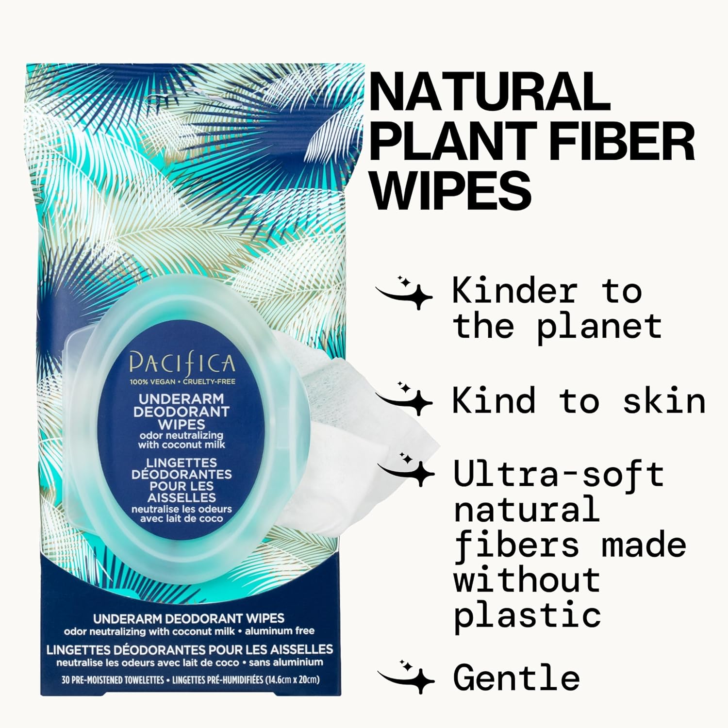 • COCONUT MILK DEODORANT WIPES – Keep fresh on-the-go with these aluminum-free deodorant wipes. Infused with coconut milk and essential oils, Pacifica’s Underarm Deodorant Wipes neutralize odors and wipe away sweat anytime, anywhere​. The 100% cotton wipes are soft and gentle on skin, perfect for post-workout, travel, or a quick refresh between showers. Enjoy a light natural coconut scent as these wipes leave you feeling clean and confident without any sticky residue or overpowering perfume.