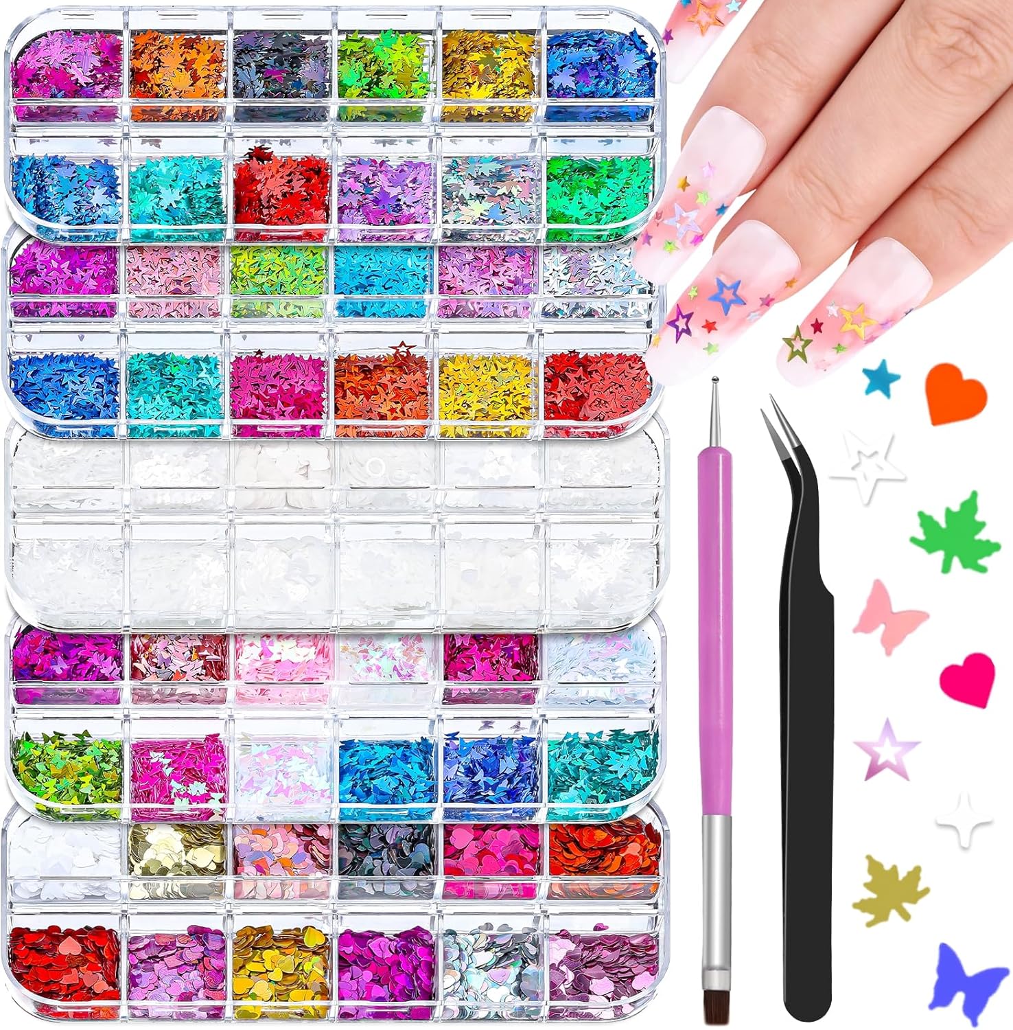 • Nail Sequins Decoration Kit: You'll get 5 boxes of mixed-shaped sequins (butterflies, hearts, stars, moons, flowers, diamonds, etc.), 1 pair of precision tweezers, and 1 cs of dual-end nail brush/dotting pen—everything you need for stunning nail art!