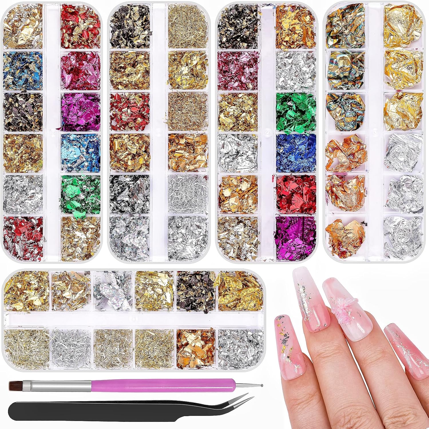 • Nail Glitter Flakes Kit: You'll get 5 boxes of nail foils, 1 pair of precision tweezers, and 1 cs of dual-end nail brush/dotting pen—everything you need for stunning nail art!